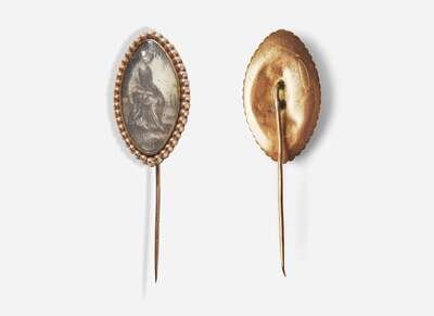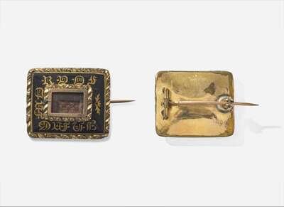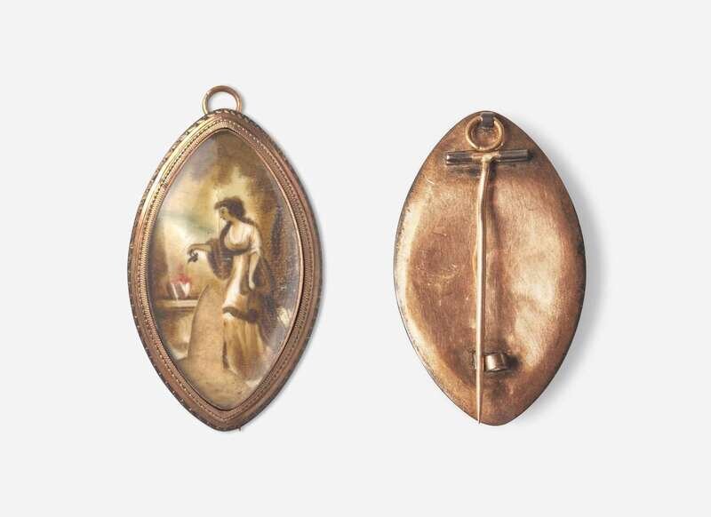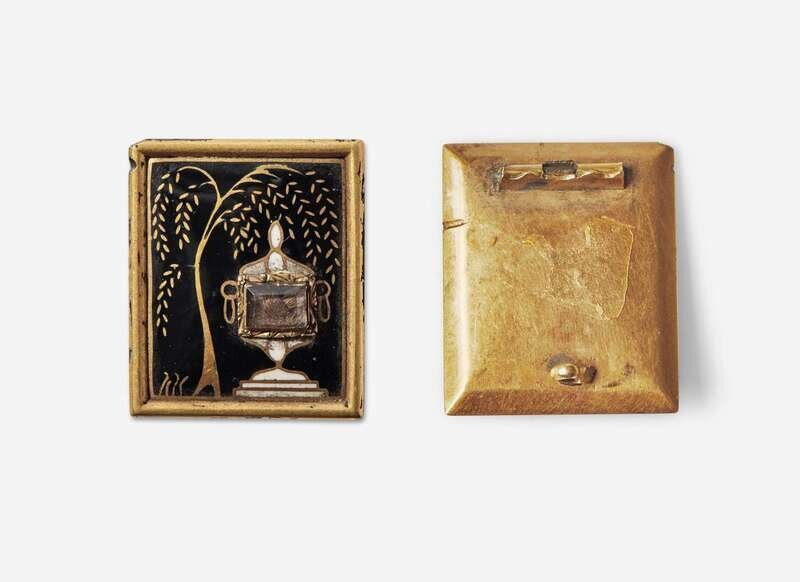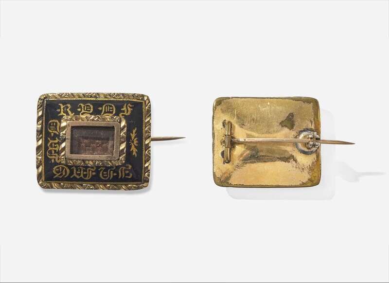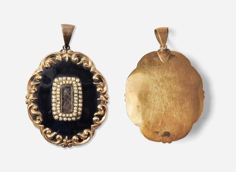 Including a navette form brooch worked in polychrome of a woman watering a plant; a navette form pin worked en grisaille of a mourning figure; a rectangular enameled brooch inset with tree, urn and hair; a small oblong enameled brooch inlaid with initials and inset with hair; a large enameled pendant with scrolled giltwork border and seed pearls enclosing inset hair; a gold jewelry clasp engraved with brightwork enclosing a scene en grisaille with love bird-topped tombstone inscribed, “Amor Vincet Omnia”; and a enameled and gold rectangular brooch inset with initials and hair.