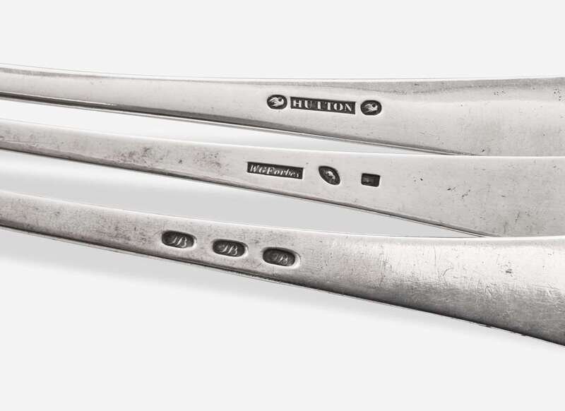 Each with bright-cut decoration; comprising a ladle by William Garret Forbes, with drop at bowl back, engraved with monogram, “JSB,” marked; a ladle by Isaac Hutton, with drop at bowl back, engraved with a crest in the form of a masted ship, marked; and a ladle by John Bedford, with drop at bowl back, engraved with monogram, “AP,” marked three times to underside of handle.