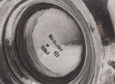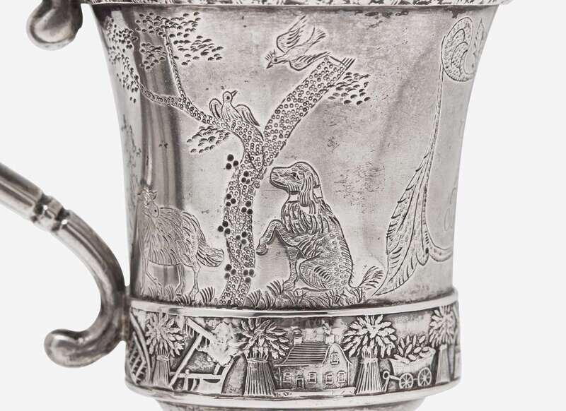 Comprising a cup with flared rim on footed base, with scrolled handle, the body decorated with engraved scene depicting dogs and sheep beneath trees with birds aloft, surrounding cartouche engraved, “A.T. from T.M.M.,” also with applied band of motifs including scythes, sheaths of wheat, rakes and plows, wagons, windmills, beehives, and houses, marked to underside; and a child's cann, of baluster form, on footed base, with scrolled handle, engraved to front, “Charlotte Rose Irwin April 26th 1839,” marked.