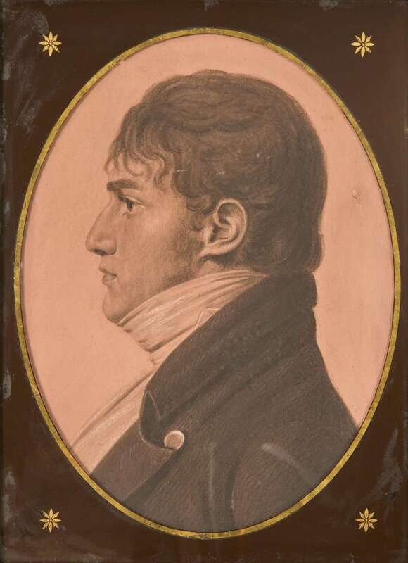 Black and white chalk on colored paper, eglomise mat, retains original frame, with biographical notes on verso.