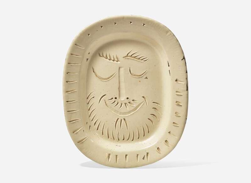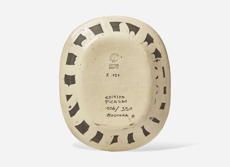 1955, incised and numbered 'I 121 / EDITION PICASSO / 106/350 / MADOURA’, and stamped 'MADOURA PLEIN FEU' and 'EDITION PICASSO' on the underside. White earthenware clay dish with knife engraved decoration under brushed glaze, and with grey patina.