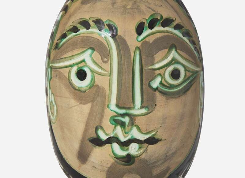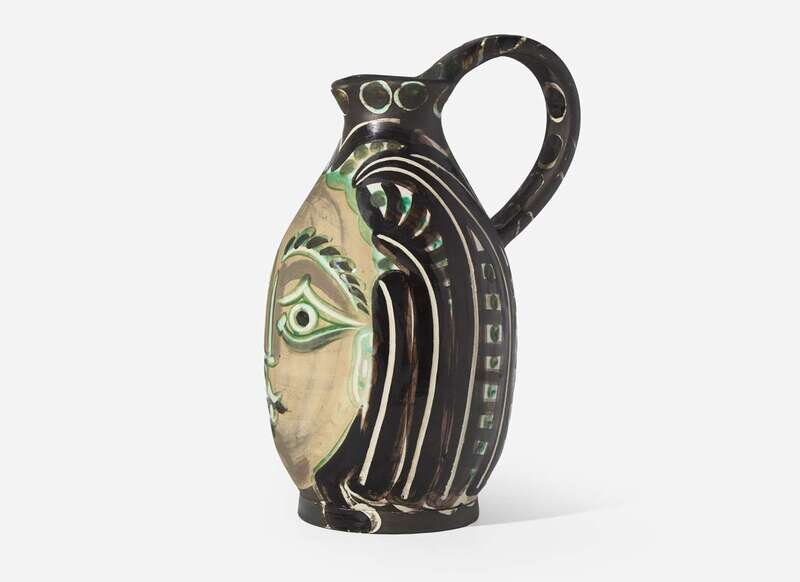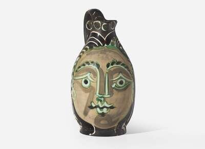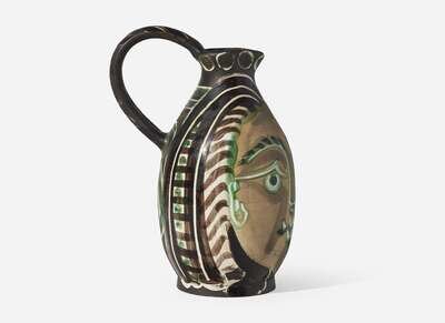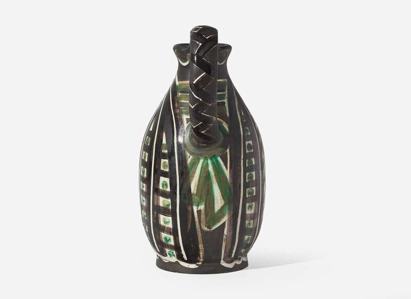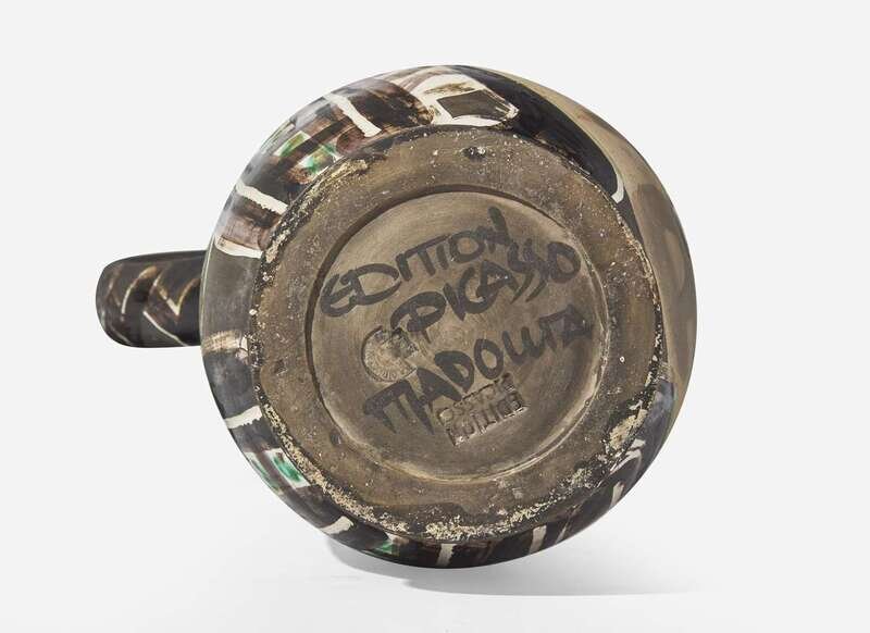1953, from the edition of 500, inscribed ‘EDITION PICASSO' and 'MADOURA,’ stamped 'MADOURA PLEIN FEU' and ‘EDITION PICASSO’ on the underside. White earthenware turned pitcher with decoration in engobes and knife engraved under partial brushed glaze.
