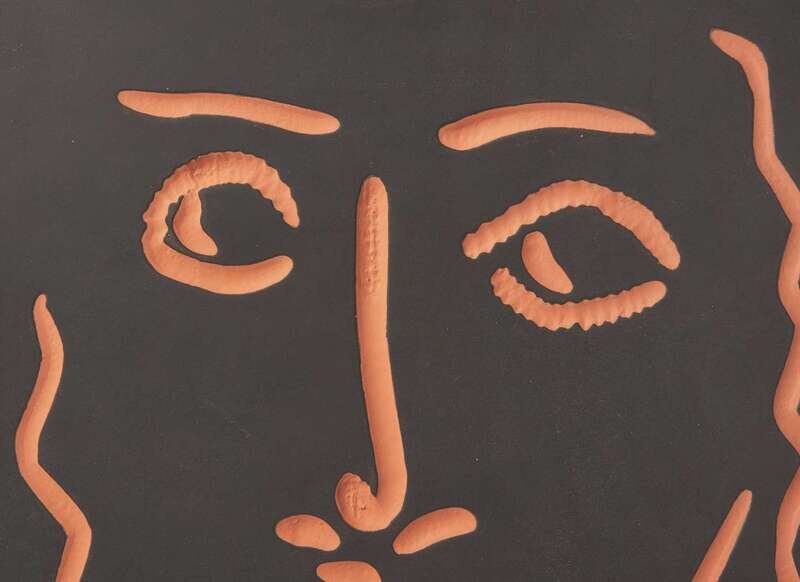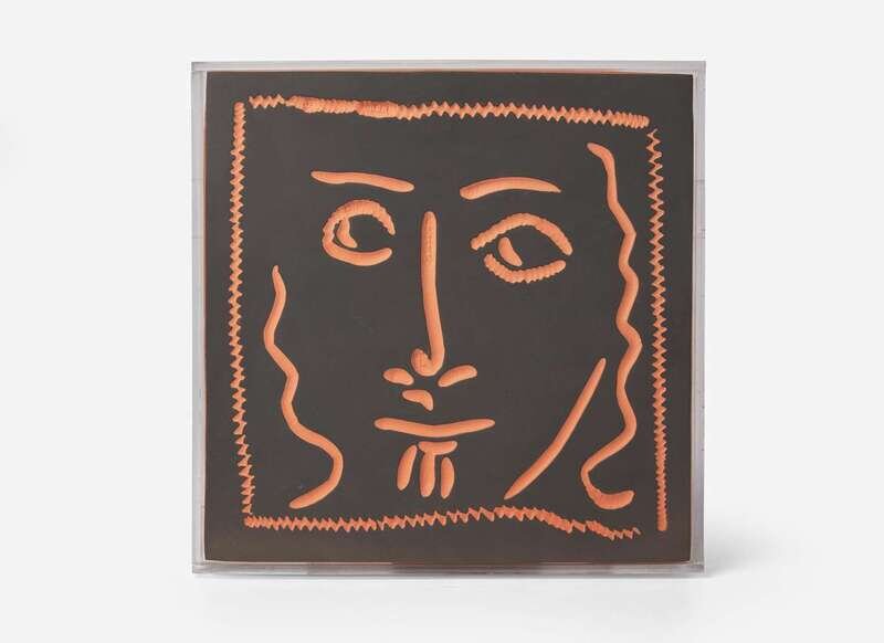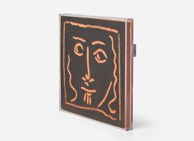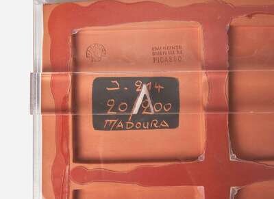 1968/1969, numbered 20/200, annotated ‘J.214’ and stamped 'MADOURA PLEIN FEU' and 'EMPREINTE ORIGINALE DE PICASSO' on the underside. Red earthenware clay plaque, printed with engobe pad.