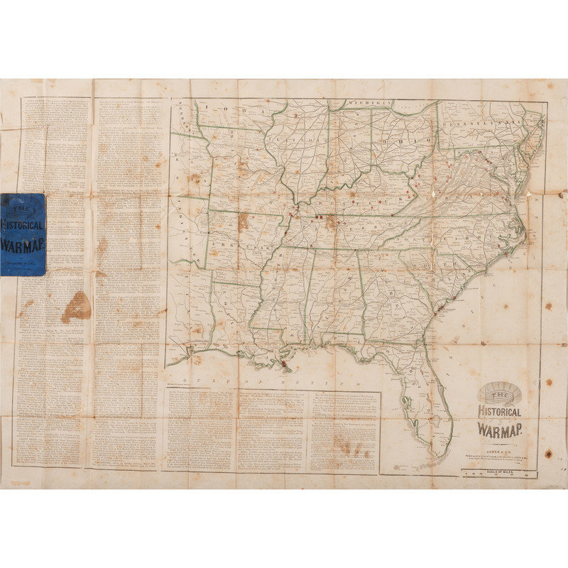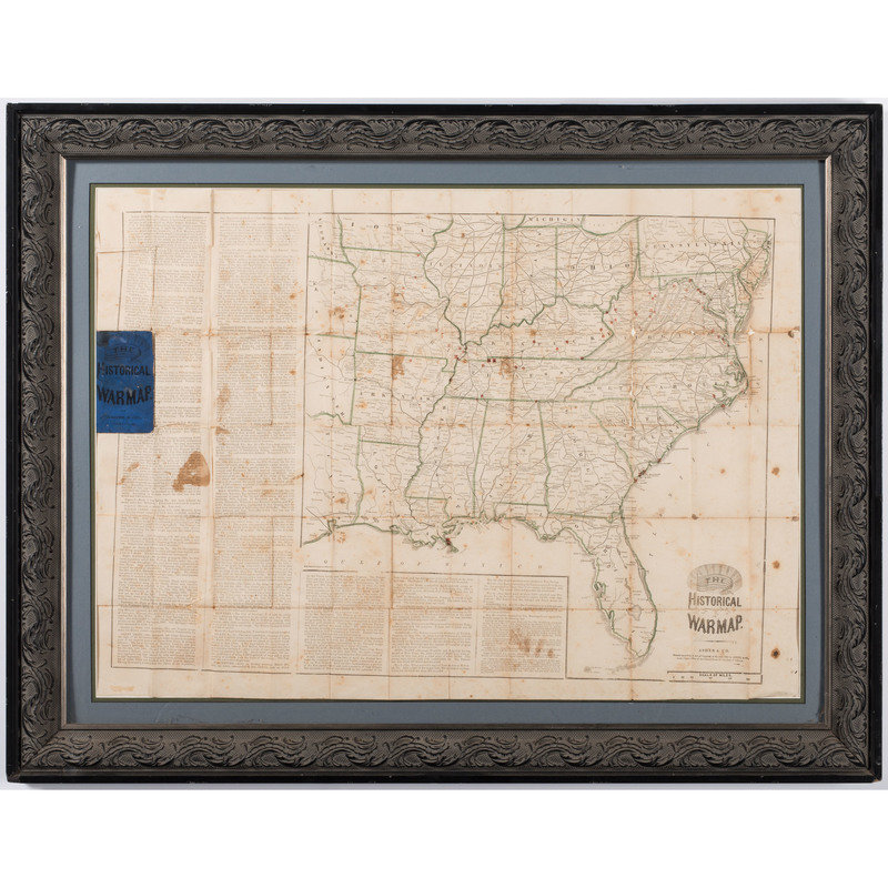 Map by Asher & Co., Indianapolis, IN, printed 1862, 26.25 x 36.25 in. (sight), professionally framed to 35 x 45 in. Accompanied by a smaller frame containing a war-date letter, leather wallet, and typed sheet containing information regarding the soldiers of the 100th Indiana mentioned in the letter. Letter is 2pp, dated [no month] 25th, 1863, at Collier Ville, TN, from an ailing Private William St. John, addressed to his family, transcribed by his comrade Amos. R. Sewell. St. John relates that he is ill and updates his parents on the status of others from his hometown. He had enlisted in Co. G on August 16, 1862, and HDS lists him as dying in November 22, 1863, just three days before the 100th took part in the Battle of Missionary Ridge, where 18 of its men were killed.