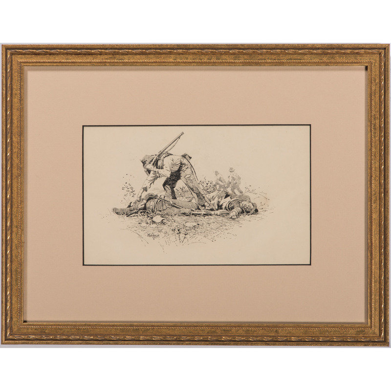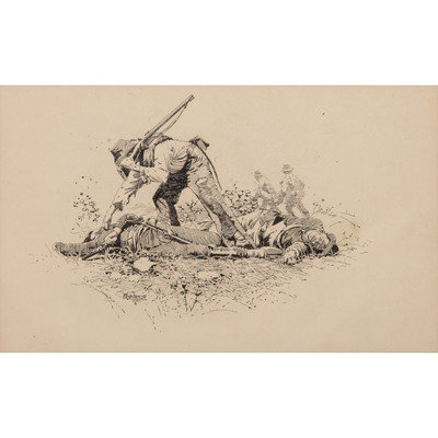 Pen and ink on paper, 9 x 5.5 in. (sight), framed to 15.5 x 12 in. Signed lower left. Published in The American Heritage Century Collection of Civil War Art, Plate 286.