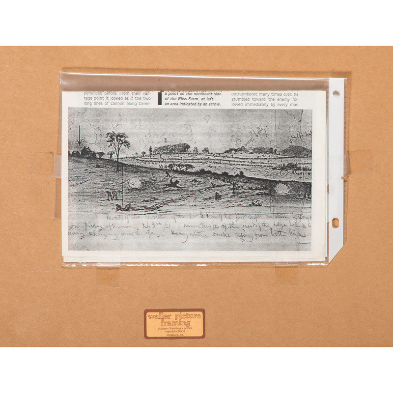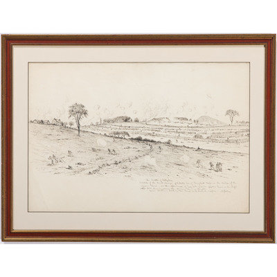 Pen and ink on paper, 19.5 x 13 in. (sight), framed to 24.25 x 18.25 in. Inscribed and signed lower left, "The Battle of Gettysburg / Sketch of the Great Charge of Picketts Div of Longstreets Corps on the centre of the / Union Line. On the afternoon of July 3rd 1863. Ziegler's Grove on the Left. / Culps Hill showing above the Union Line on Right. / Union position held by the First and Second corps. E. Forbes."