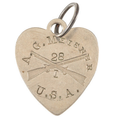 Research indicates that this charm may have been made for George H. Meisner (ca 1843-1926), who served with Company G of the 28th Illinois Infantry, by his son Albert George Meisner (1879-1932), as an affectionate token commemorating his father's military service and celebrating the people and places he held most dear. The elder Meisner was born in the Netherlands and immigrated to the United States with his parents as a child, and census records indicate that the Meisners had settled in Saratoga, IL by 1860. During the next few years, George worked as a farmer before enlisting as a private on January 4, 1864. He initially served with Co. D, 91st Illinois Infantry and was transferred to Co. G, 28th Illinois Infantry on July 4, 1865. His regiment participated in important battles in the Western Theatre, such as Spanish Fort and Fort Blakeley, and later assignments included the occupation of Brazos Santiago, Clarksville, and Brownsville, TX. After the war, George settled in Glen Ellyn, IL, where he worked as a machinist. His first child, Albert George, was born in 1879 and also worked as a machinist prior to his service in the First World War. The tag's heart shape and personal inscriptions, which capture George's battle unit, firstborn son's initials, and post-war residence, suggest that it may have been designed by Albert as a composite memento for his father.
