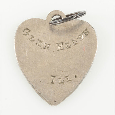 Heart-shaped charm, white metal, .875 x 1.125 in., obverse identified to "A.G. Meisner / 28 / I / USA," with crossed rifles at center; reverse with "Glen Ellyn / Ill."