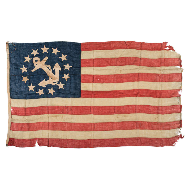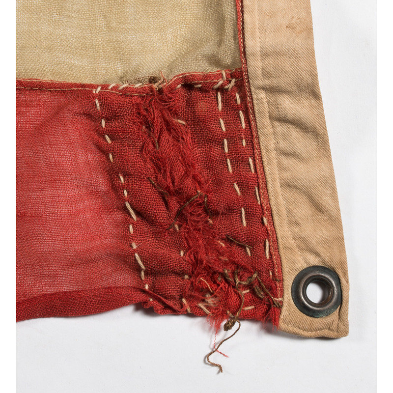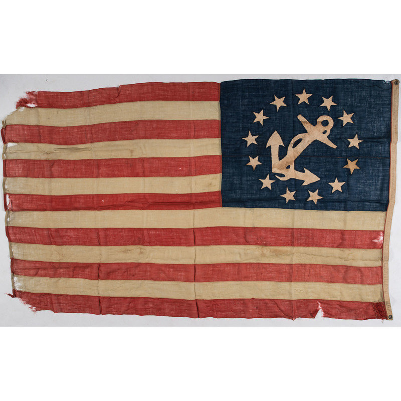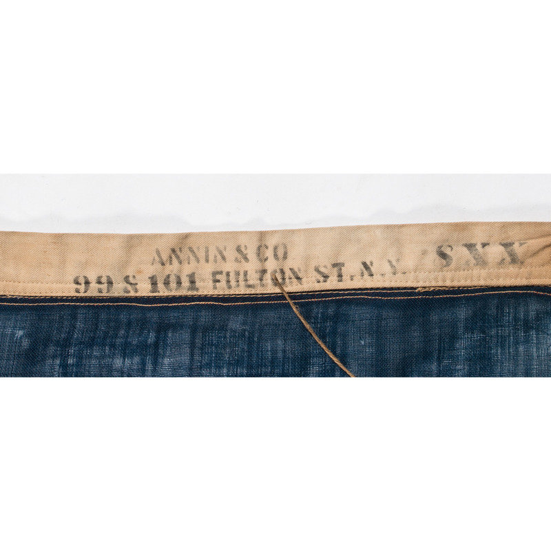 Wool, primarily machine construction, approx. 57 x 91 in., with 13 hand-sewn cotton "peekaboo" stars and anchor, ca 1849-1870 era. Two brass grommets in cotton duck hoist. Stamped on hoist "Annin & Co. 99 & 101 Fulton St. N.Y." The company was at that location from 1847-1925.