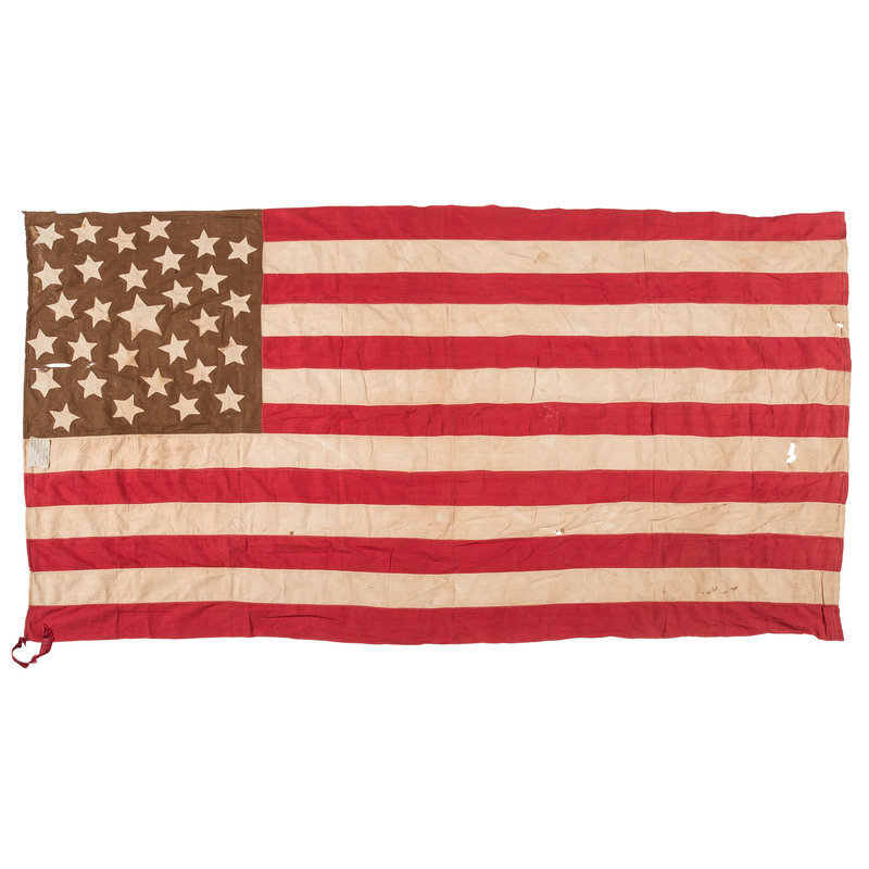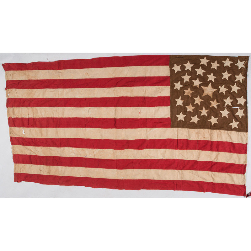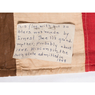 Cotton, approx. 44 x 82 in., machine-sewn flag with 30 hand-sewn, double-applique cotton stars. Note stapled to hoist edge: "This flag, with but 30 stars, was made by Ernest Smell's grand-mother; probably about 1848. Wisconsin, the 30th state admitted in 1848."