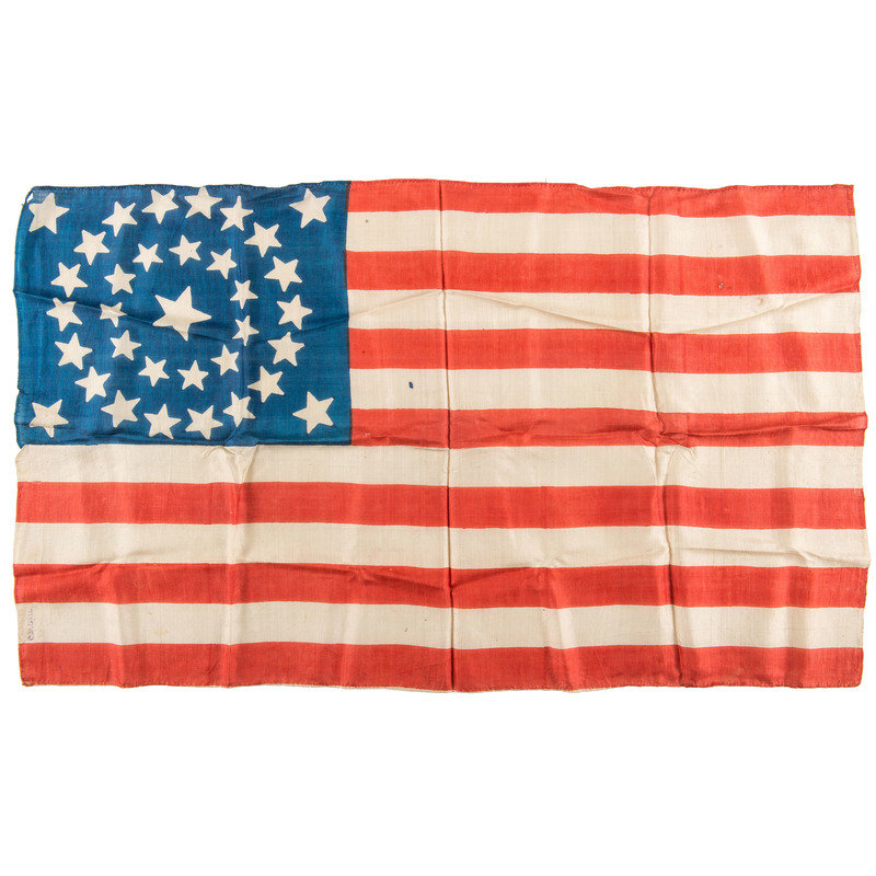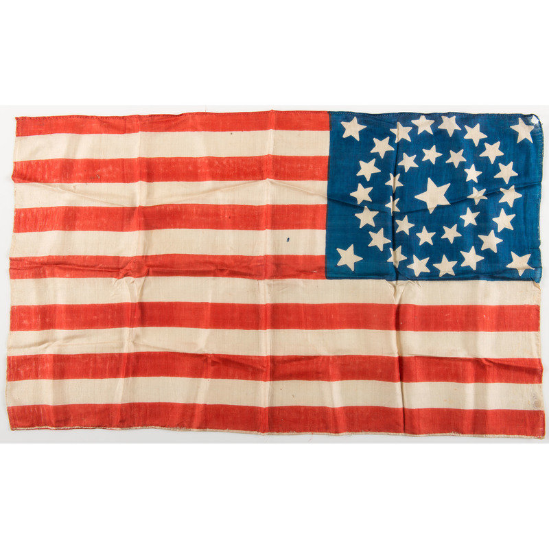 Lot of 2. Silk, 18 x 30 in., printed flag with 34 stars configured in double medallion pattern, with central star, flanked by star in each corner. With inked identification, "C.D. Sill" at lower left edge of last white stripe. Kansas, our 34th State, was admitted into the Union in January 1861, and although there is no specific provenance connected to this flag, it was likely made during the Civil War-period, ca 1861-1863.