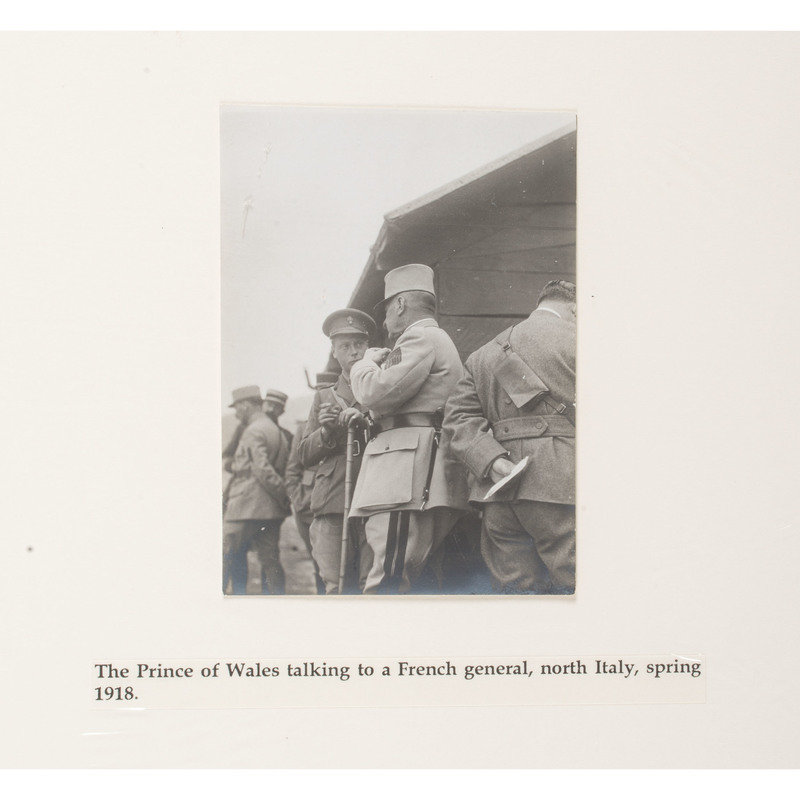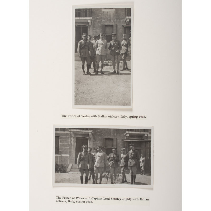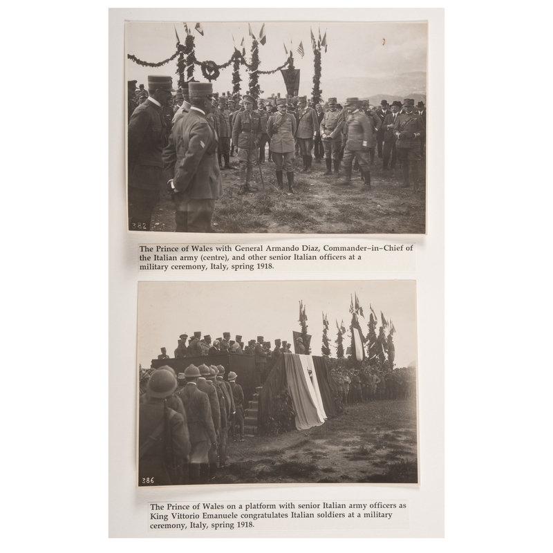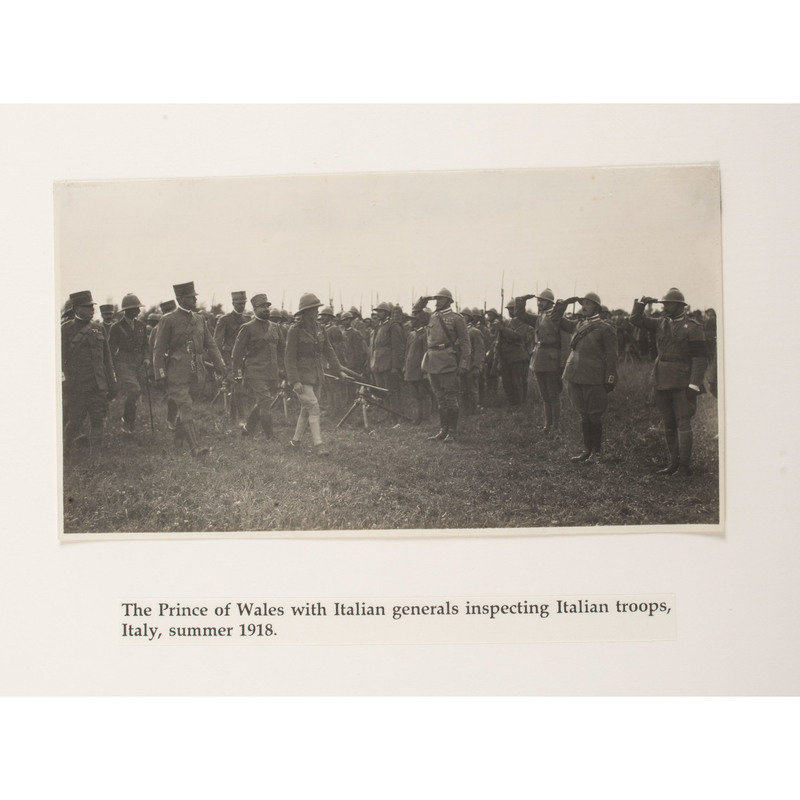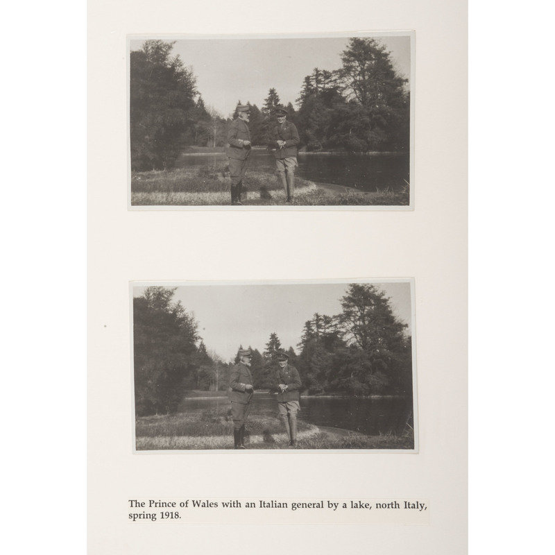 Lot of 18 photographs, ranging in size from 3.375 x 3.5 in. to 6.75 x 3.5 in., matted individually or in groups to 14.5 x 18.5 in., documenting the wartime visit of His Royal Highness, Edward VIII (1894-1972), Prince of Wales (later King of England and Duke of Windsor) to Italy in 1918. Most of the photographs show the Prince in uniform, captured in conversation with diplomats and fellow officers or participating in military ceremonies. Among his companions in these photographs are Sir Rennell Rodd, the British Ambassador; Geoffrey Scott, Press Attaché; Lieutenant-General Lord Cavan; Captain Lord Claud Hamilton; Italian General Armando Diaz; Captain Lord Stanley; and King of Italy Vittorio Emanuele III.