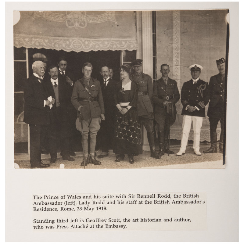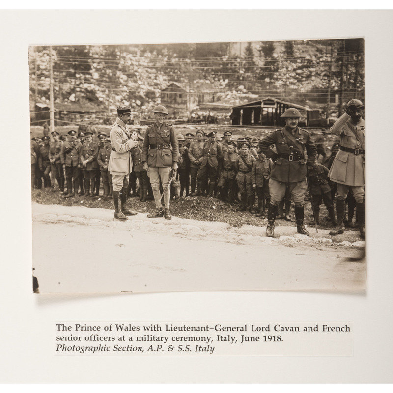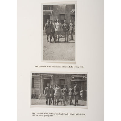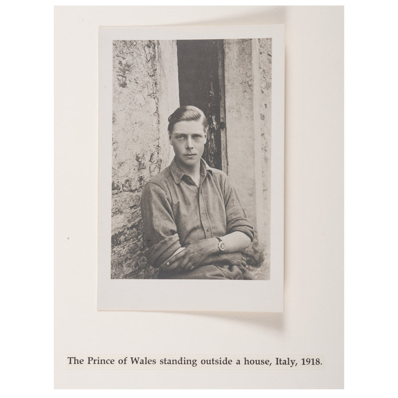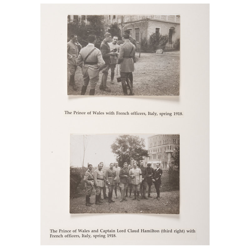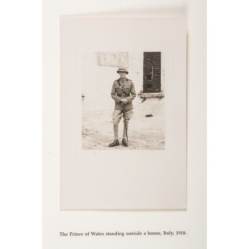 Lot of 18 photographs, ranging in size from 3.375 x 3.5 in. to 6.75 x 3.5 in., matted individually or in groups to 14.5 x 18.5 in., documenting the wartime visit of His Royal Highness, Edward VIII (1894-1972), Prince of Wales (later King of England and Duke of Windsor) to Italy in 1918. Most of the photographs show the Prince in uniform, captured in conversation with diplomats and fellow officers or participating in military ceremonies. Among his companions in these photographs are Sir Rennell Rodd, the British Ambassador; Geoffrey Scott, Press Attaché; Lieutenant-General Lord Cavan; Captain Lord Claud Hamilton; Italian General Armando Diaz; Captain Lord Stanley; and King of Italy Vittorio Emanuele III.