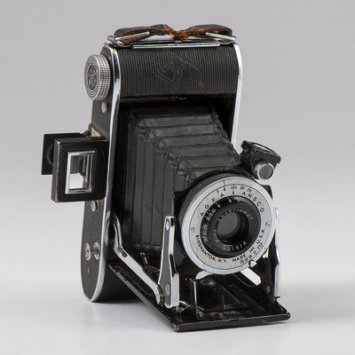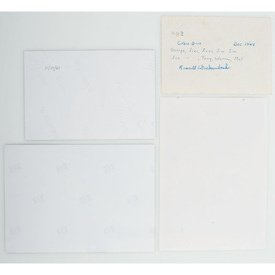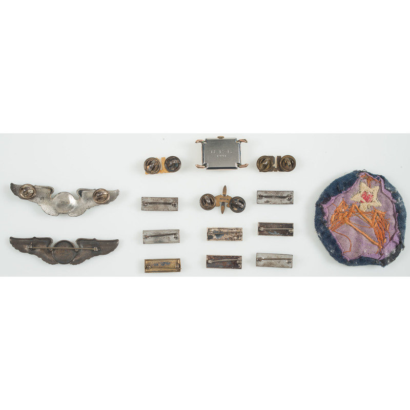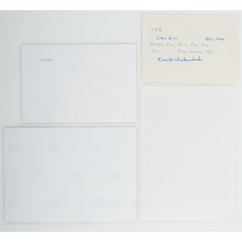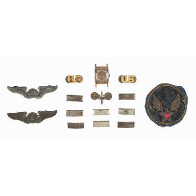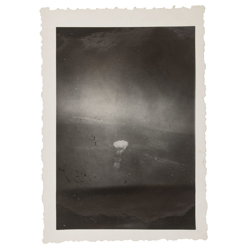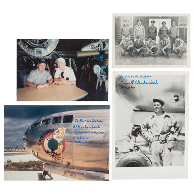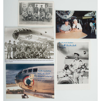 Archive of Lt. Russell E. Gackenbach, the last surviving crew member of the three strike planes that carried out the first wartime use of an atomic bomb in human history, including the only known non-government photograph of the mushroom cloud over Hiroshima which resides in private hands, 2.5 x 3.5 in., inscribed on verso Hiroshima 6 Aug and signed Taken by Russell Gackenbach; the Agfa PB 20 Viking camera with which it was taken; a note signed by Gackenbach attesting that the camera was the one used on Necessary Evil on Aug. 6, 1945; a 5 x 7 in. photograph of Gackenbach in front of the front landing gear of Necessary Evil, Signed Russell E. Gackenbach, Navigator, with inscription to Richard DeRosa; a 5 x 7 in. photograph of Necessary Evil, signed R.E. Gackenbach/ Navigator 6 Aug ‘45/ Hiroshima Photo plane; a 3.5 x 5 in. photograph of a crew of ten, with Gackenbach at center, inscribed Crew B-10, Dec. 1944, and signed Russell E. Gackenbach; a photograph of an aged Gackenbach, dated 11/11/01; AAF cloth chart No. C-52 Japan and South China Seas /No. C-53 East China Sea, 31 x 33 in.; two US Army Air Force Navigator Wings; eight lieutenant’s bars; two U.S. flight officer insignia; a US Army Air Force aviation cadet pin; and a theatre-made US Army Air Force patch.