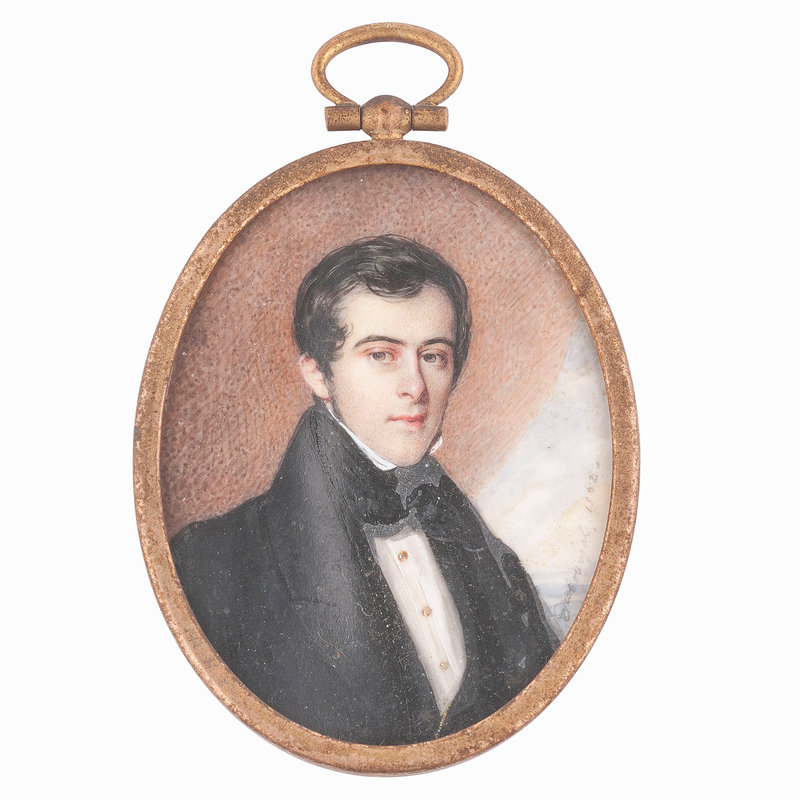 Oval portrait miniature on ivory believed to be of Robert Tyler (1805-1852). Signed "Dubourjal, 1832." Approx. 2.25 x 3 in. French portrait artist Savinien Edme Dubourjal (1795-1853) worked in the United States as well as France, though the exact dates of his time in the United States are unclear. Dubourjal exhibited at the New York Academy and appears to have been active from the early 1820s through 1850. His work is relatively rare, and his sitters included many prominent individuals of the time period such as Henry Clay and John C. Calhoun.