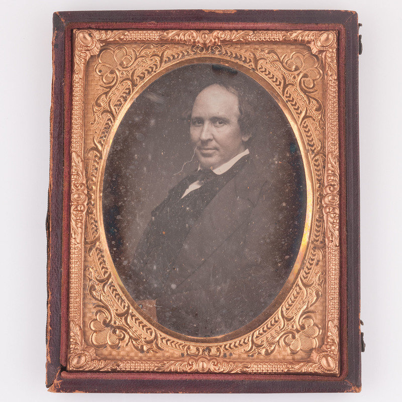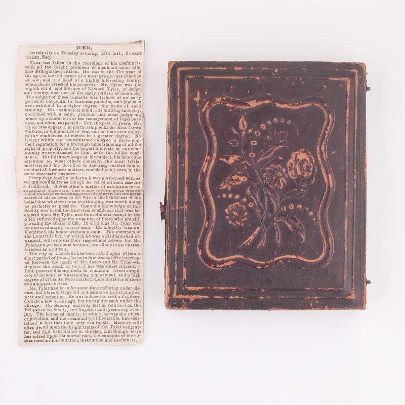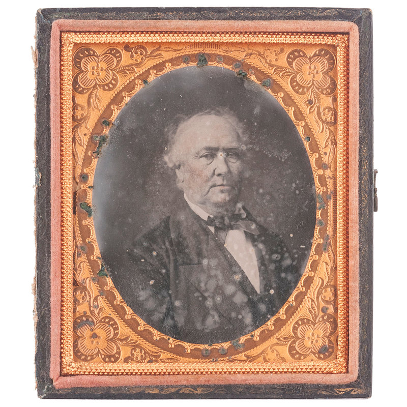 Quarter plate daguerreotype of Robert Tyler housed in a full pressed paper case separated at spine. Accompanied by clipped newspaper obituary for the sitter.