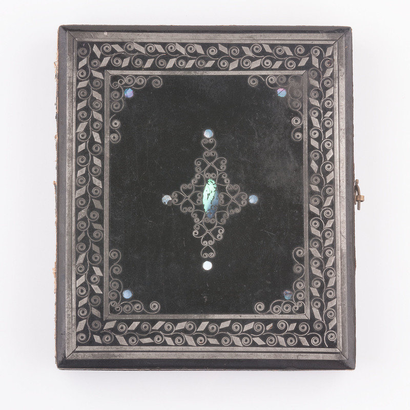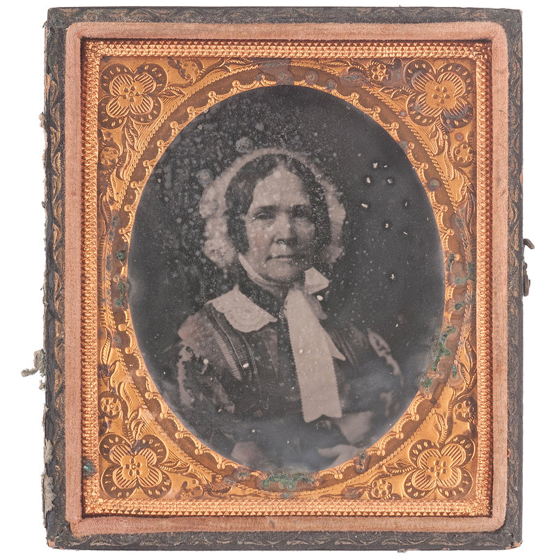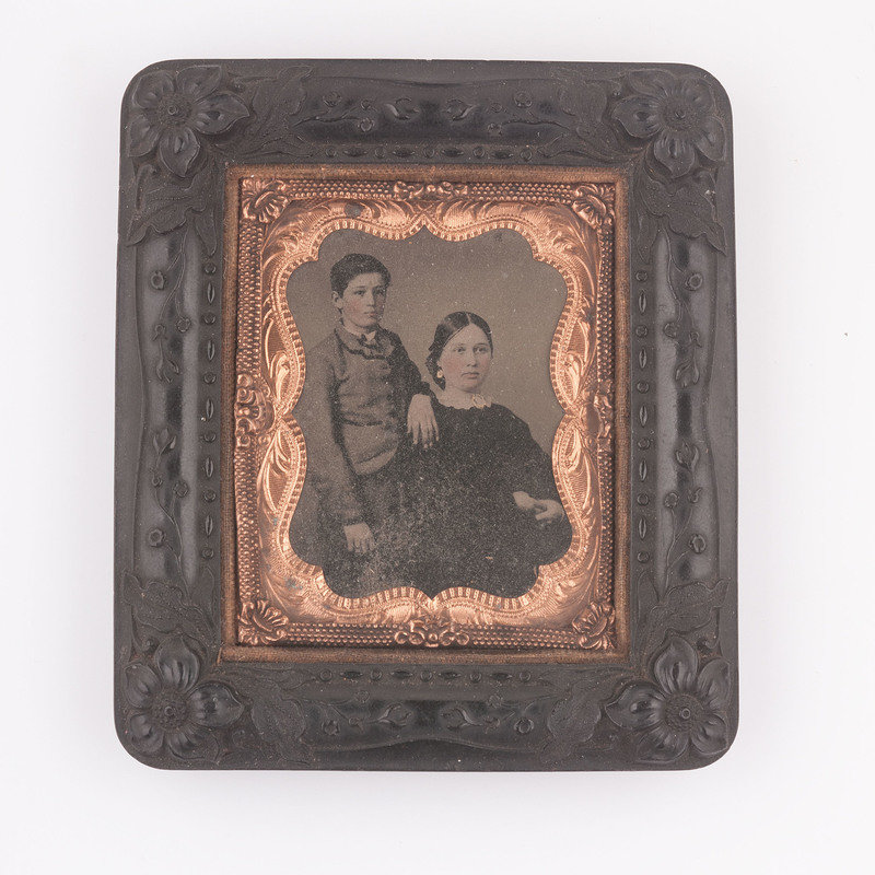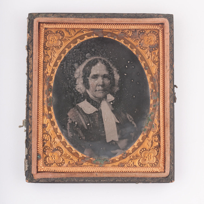 Two sixth plate melainotypes, with the back of each plate inscribed "Febry 1858," of Captain Henry Johnson (1794-1862) and Elizabeth Julia Flournoy Johnson (1800-1882). Images appear to have originally been housed in matching cases but only one mother of pearl inlaid front case survives on which the velvet pad is marked "Theo. Harris / Artist / Louisville." Captain Henry Johnson, the youngest son of Jemima and Robert Johnson, served with his brother (and future US Vice President) Richard Mentor Johnson during the War of 1812. Following the war he married Elizabeth Julia Flournoy (1800-1882) of Fayette County, Kentucky. The two maintained plantations in both Kentucky and Mississippi.