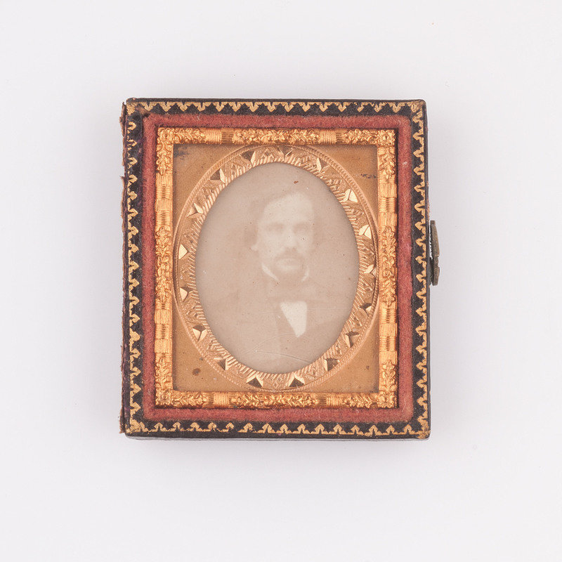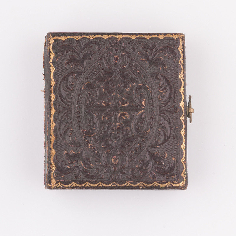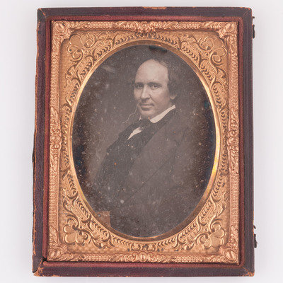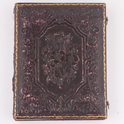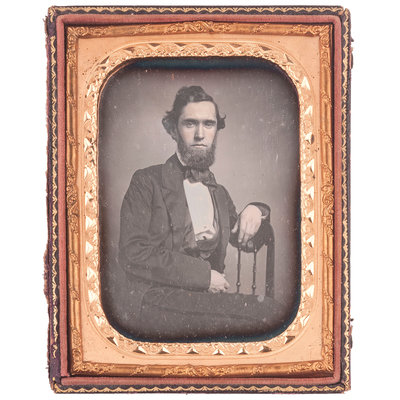 Quarter plate daguerreotype of Charles Flournoy Johnson housed in a full leather case with mat stamped "Easterly" on lower left and "St. Louis" on bottom right. Inscription in pencil behind image reads "Mrs. Jo / Mr. C. F. Johnson / 12 / [indecipherable]." Colonel Charles Flournoy Johnson (1829-1920), the son of Captain Henry Johnson and Elizabeth Flournoy Johnson, served as the aide-de-camp to Confederate General Simon Bolivar Buckner throughout the Civil War. (See also Lot 49, a half plate ambrotype showing two Confederate soldiers who are believed to be Colonel Charles F. Johnson and his older brother Colonel Robert Adams Johnson.)