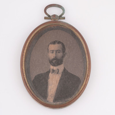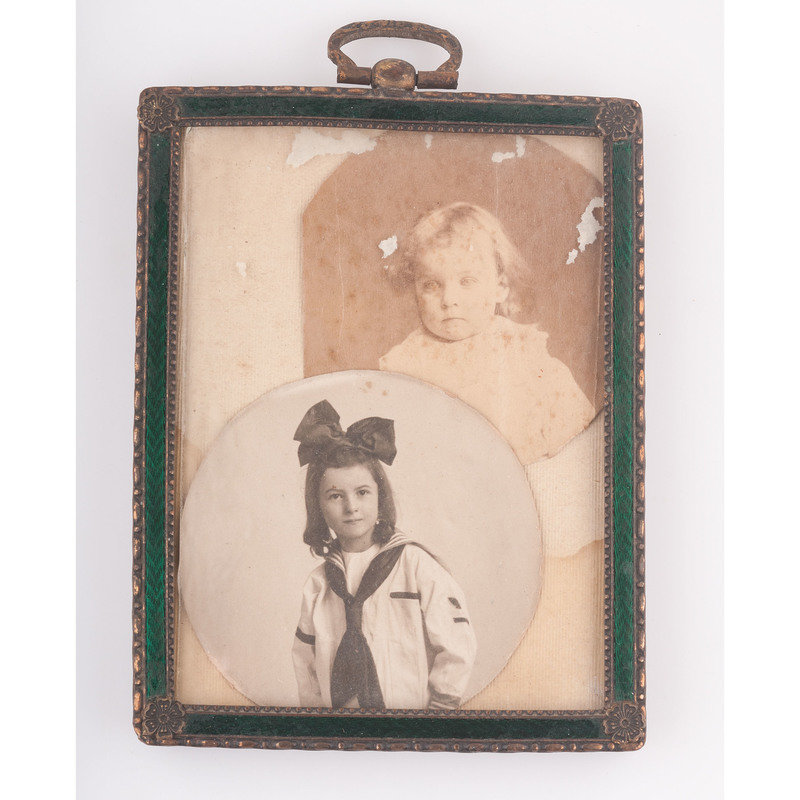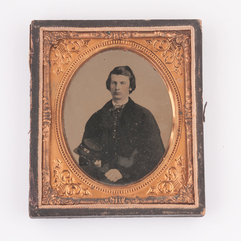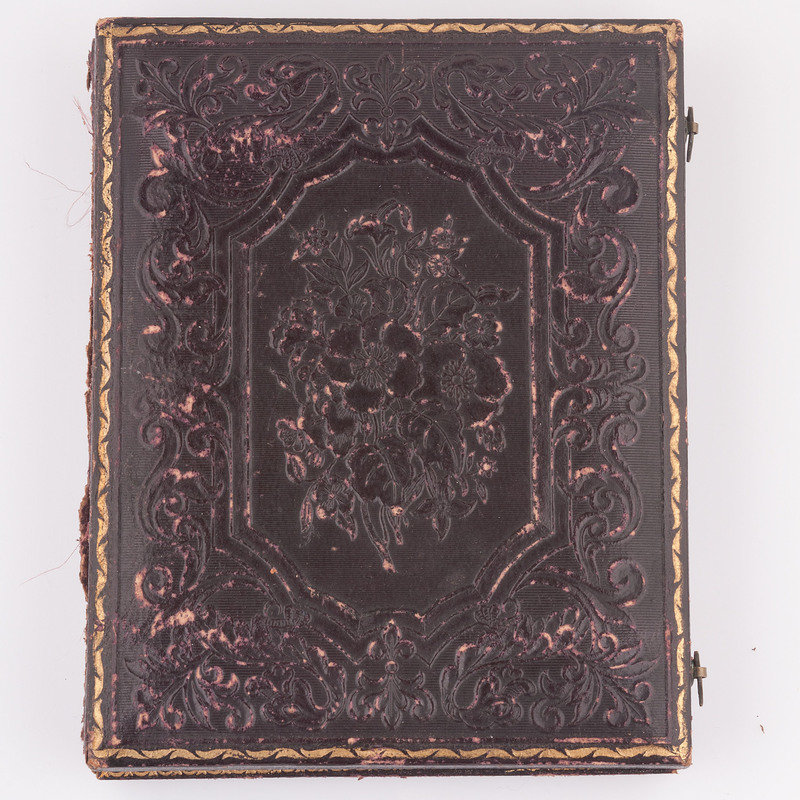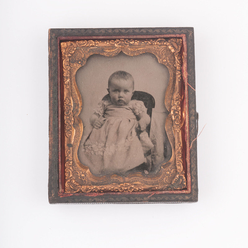 The remaining images in the collection are of unidentified subjects, however, all are thought to be later members of the Johnson and Tyler families. Additional images include: sixth plate ambrotype of an unidentified young man in non-regulation military uniform holding a kepi with the letters "CV," housed in a pressed paper half case; ninth plate tintype housed in thermoplastic frame of an unidentified young woman seated with an unidentified young child standing beside her; ninth plate ambrotype of an unidentified infant housed in pressed paper half case; albumen photo of an unidentified man housed in full sixteenth plate pressed paper case which is separated at spine; albumen photo of unidentified man in brass oval frame with "Lycett / Baltimore" engraved on verso of frame; albumen photo of unidentified woman in an ornately decorated brass oval frame with a floral scroll motif; albumen photo of an unidentified toddler and another of a young girl, both cut to circular configuration and inserted together into a frame.
