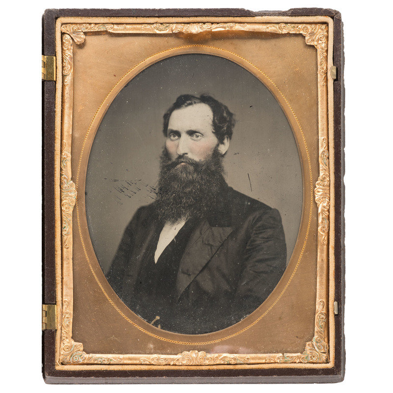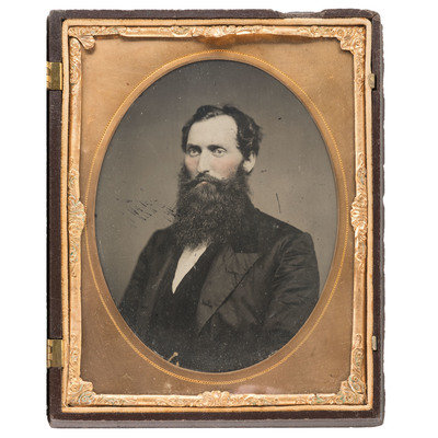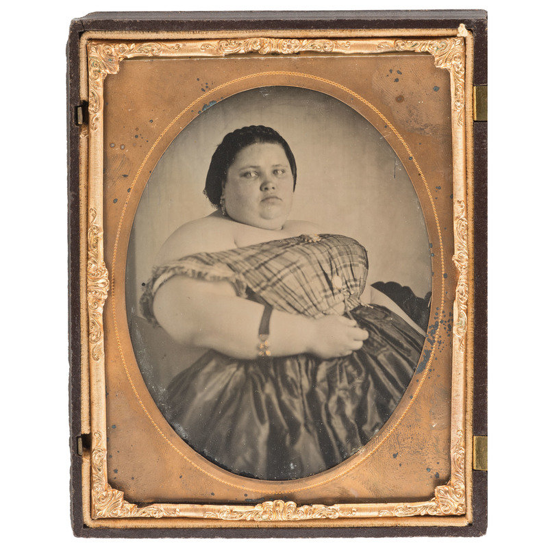 Lot of 2 half plate ambrotypes housed in full thermoplastic case, bearing a geometric/scroll design. The first features a bearded man clad in a dark suit, while the second depicts a corpulent woman wearing a patterned dress and gold jewelry. Though moderate heaviness was idealized during the nineteenth century as an indication of wealth, status, and fertility, it was never desirable to be extremely overweight. Women of significant heft were frequently ridiculed, marginalized (there was a prevailing correlation between promiscuity and obesity in the last quarter of the century), or included as sideshow performers in itinerant circus troupes.