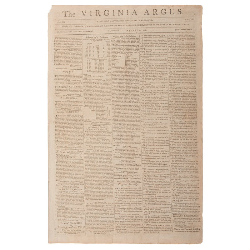 Virginia Argus. Richmond, VA: Samuel Pleasants, Jr., January 23, 1804. Vol. 21, No. 1110. 4pp. 12.625 x 19.5 in.