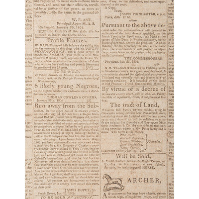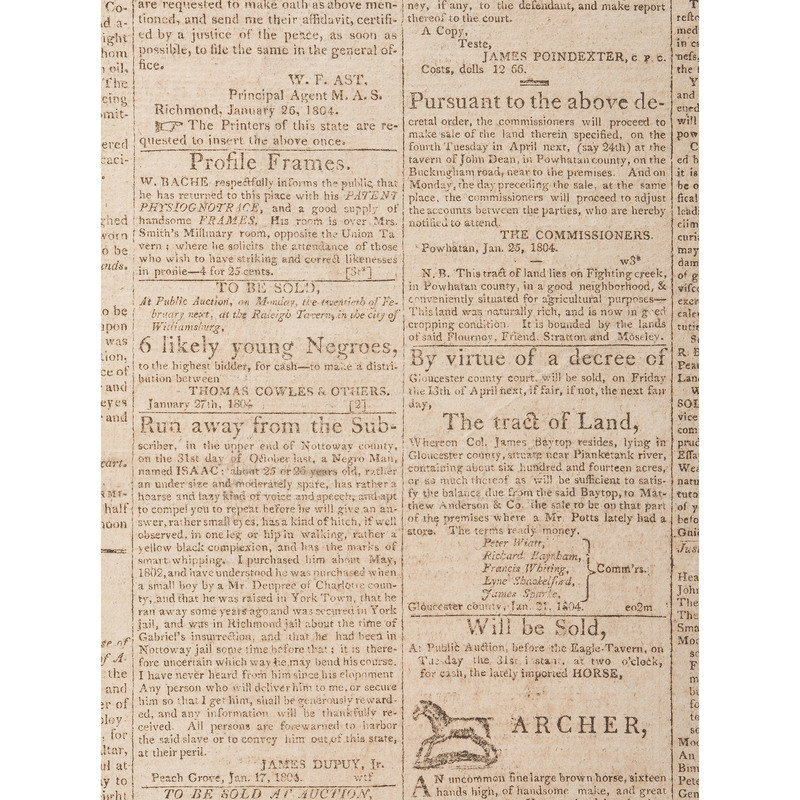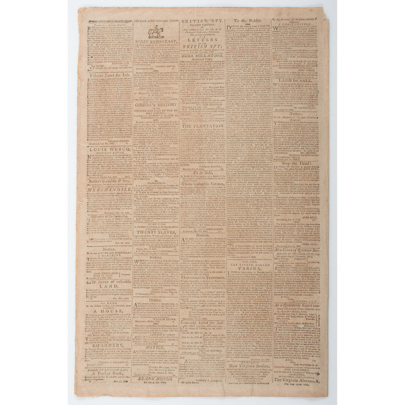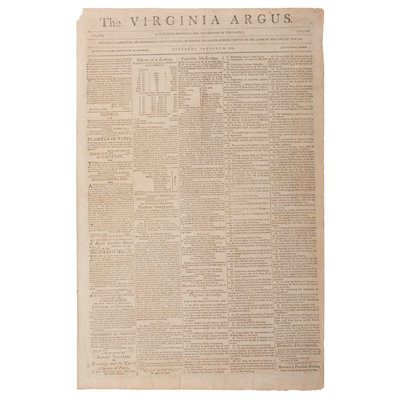 Semi-weekly publication featuring news items of international, national, and regional significance, including Congressional proceedings and communications from the Virginia Legislature's House of Delegates. With inside page coverage of the ratification of the Convention for Indemnification (1802) between the United States and Spain, as well as reporting on the anticipated passage of a bill that would establish The Bank of Virginia in Richmond. Back page with advertisement for William Wirt's The Letters of a British Spy, a popular commentary on social mores that had been published serially in the Argus the previous year. Notably includes notice of a public slave auction, to be held at Williamsburg's famed Raleigh Tavern: "6 likely young Negroes, to the highest bidder, for case - to make a distribution between Thomas Cowles & Others. January 27th, 1802."