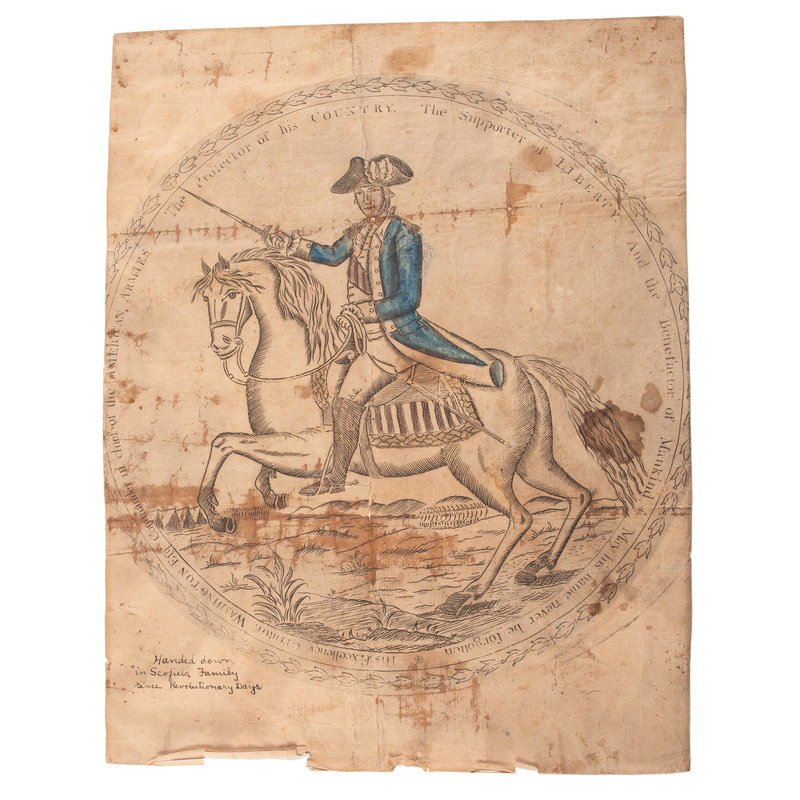 Etching, 10.875 x 14 in., matted to 12 x 16 in, ca 1785-1800. Equestrian portrait of George Washington in a stylized landscape scene, encircled by foliate border and text reading, "The Protector of his Country. The Supporter of Liberty. And the Benefactor of Mankind. May his name never be forgotten. His Excellency George Washington Esq. Commander in chief of the American Armies." Washington brandishes a sword in his right hand and wears a tricorn hat with cockade and blue jacket. Four tents are visible in the background at left. Inscription added later in pen at lower left reads, "Handed down in Scofield Family since Revolutionary Days."