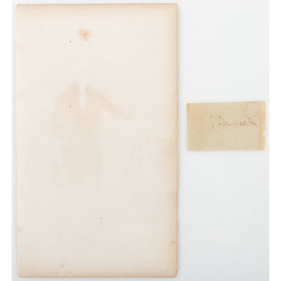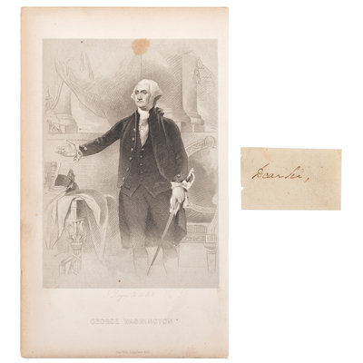 Lot of 2. Washington, George (1732-1799). First President of the United States (1789-1797). Piece of white paper, 2.125 x 1.25 in., bearing two words ("Dear Sir,") written in the hand of Washington. Accompanied by an engraving by John Rogers (American, 1808-1888) after the Gilbert Stuart Lansdowne portrait (1796) of a standing Washington holding a sword, 4.75 x 7.625 in., New York, NY: D. Appleton & Co.