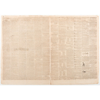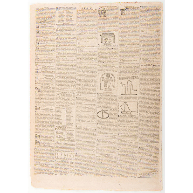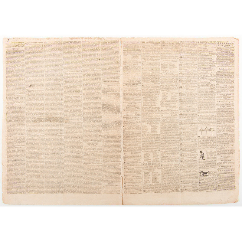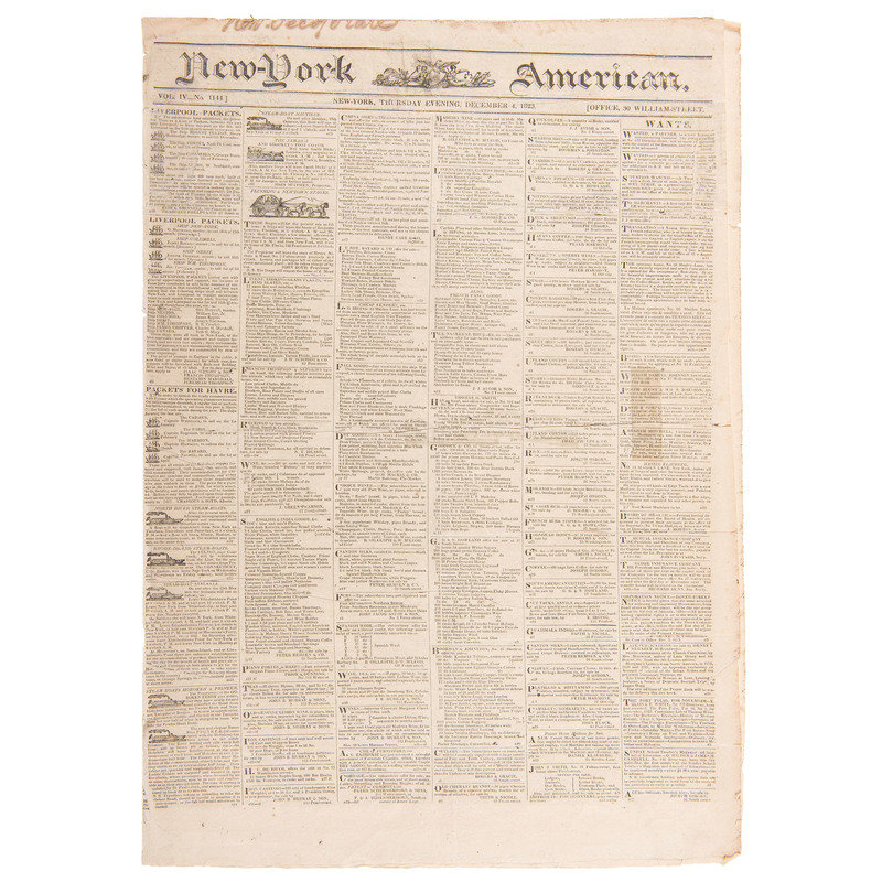 New York American. New York, NY: J.M. Elliott, Printer, December 4, 1823. Vol. IV. No. 1144. 4pp, 15 x 21 in. Identified in contemporary brown iron gall ink in the top left margin to "Hon. Sec. of State," indicating that this was John Quincy Adams' personal issue of the newspaper.