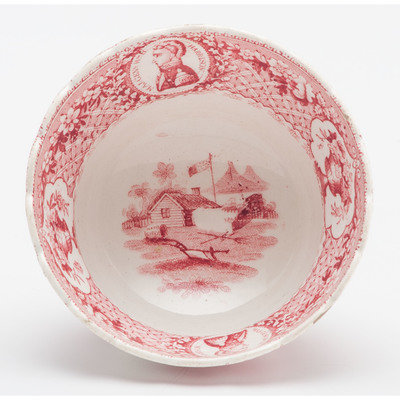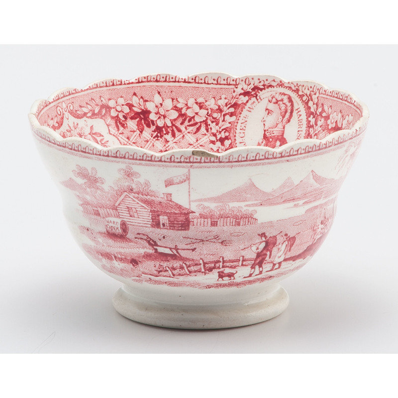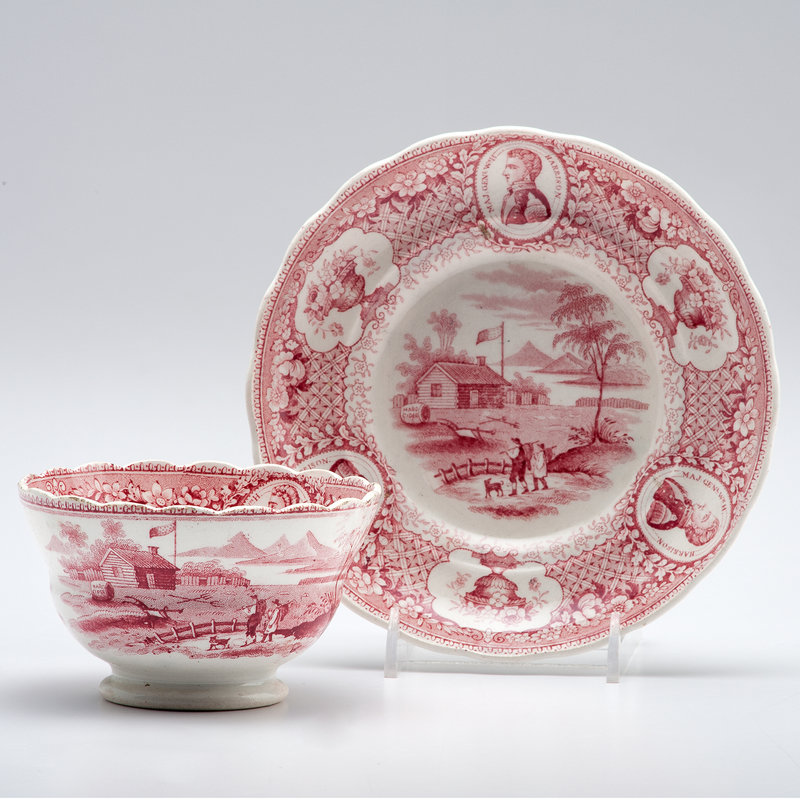 Matching cup and saucer featuring portraits of "Maj. Gen. Wm. H. Harrison" and his log cabin along the Ohio River in North Bend, OH, made for the 1840 "Log Cabin and Hard Cider" presidential campaign. Saucer 6.125 in. dia., cup 2.25 in. high.