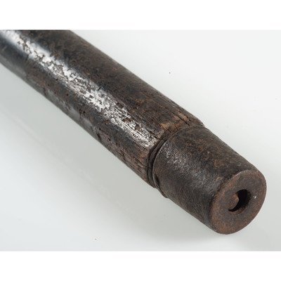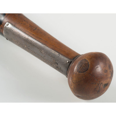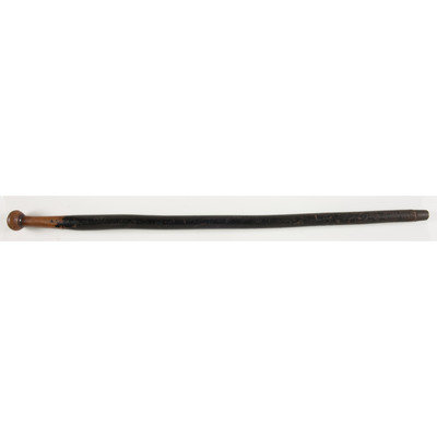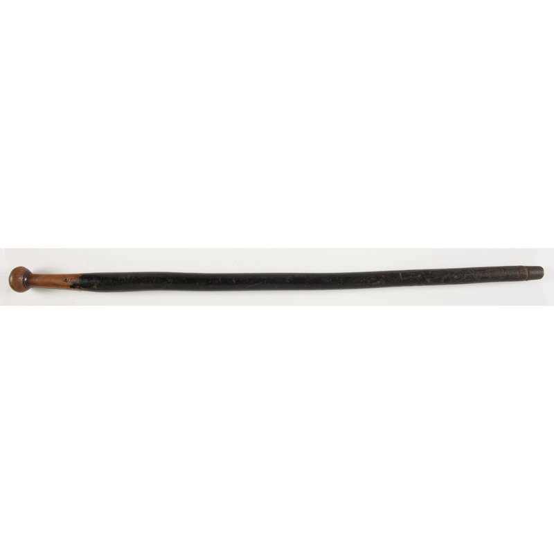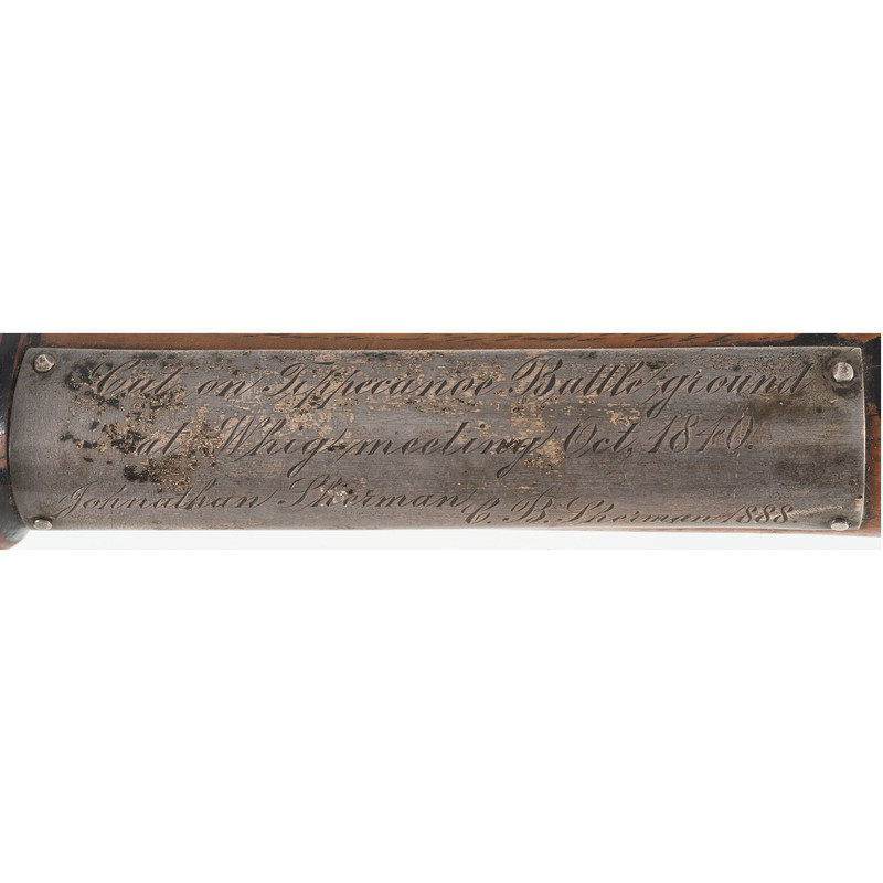 Cane, 36.5 in. overall length, with burl knob and heavy 1 in. iron ferrule. 3.5 x 1 in. plate affixed near the knob and engraved, "Cut on Tippecanoe Battleground/ at Whig meeting Oct 1840/ Johnathan Sherman C.B. Sherman 1888." A few things about this engraving are slightly off. There was a very large Whig Meeting held at the Tippecanoe Battleground in May of 1840 in support of William Henry Harrison, the Whig nominee for president, attended by an estimated 30,000 to 50,000 supporters. Another meeting was held in October of 1888 in support of Benjamin Harrison, the Republican nominee and William Henry's grandson. Benjamin Harrison had defeated John Sherman at the Republican convention on the eighth ballot, after Sherman had led the voting on the first six. John Sherman and his brothers, including General William Tecumseh Sherman and federal judge Charles Taylor Sherman, had been raised by a family friend Thomas Ewing, after the death of their father Charles Robert Sherman. Ewing was a prominent Whig, serving as US Secretary of the Treasury under William Henry Harrison, the first US Secretary of the Interior, and US Senator from Ohio. Though the inscription on the cane offered here clearly contains some errors, some Harrison-Sherman family connection seems likely.