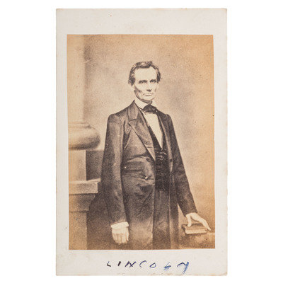 CDV of a beardless Abraham Lincoln, lacking a studio imprint but from Mathew Brady's negative made in New York on February 27, 1860, a few hours before Lincoln's famous Cooper Union speech.
