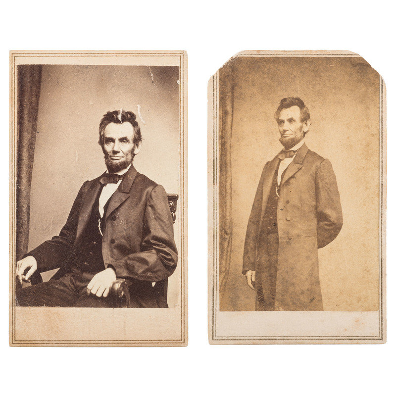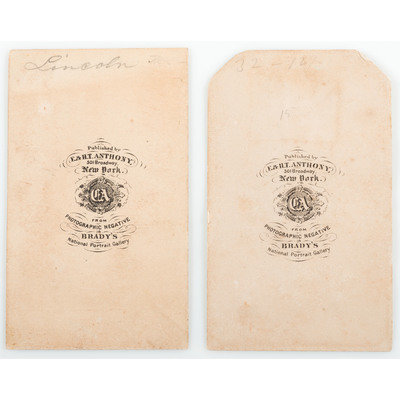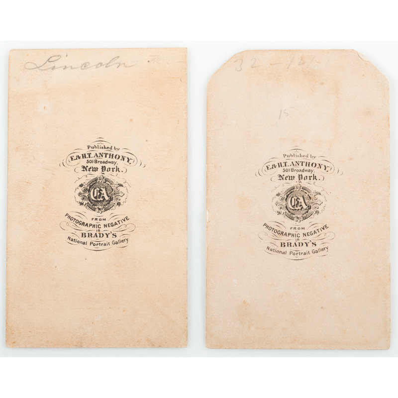 Lot of 2 CDVs of Abraham Lincoln published by E. & H.T. Anthony from Mathew Brady negatives. Brady originally captured both images at a sitting in his studio on January 8, 1864. In one portrait, Lincoln appears seated with his hands resting on the arms of a chair [O-84], while he stands in the second, with his left arm folded behind his back [O-86].