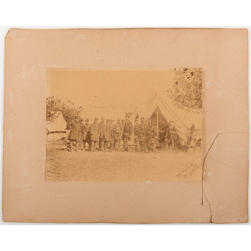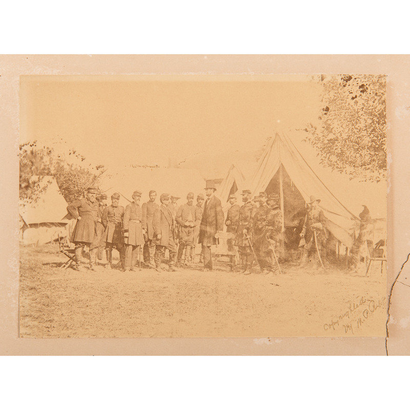 An iconic view of President Lincoln visiting General McClellan and staff shortly after the bloody battle at Antietam, the second of two famous group shots photographed by Alexander Gardner on October 3, 1862. This view was taken at General Fitz-John Porter’s nearby headquarters following Lincoln’s review of 5th Corps troops and included (from left): Col. Delos B. Sackett, Capt. Geo. Monteith, Lt. Col. Nelson B. Sweitzer, Gen. Geo. W. Morell, Col. Alexander S. Webb, Gen. McClellan, Scout Adams, Dr. Jonathan Letterman, unidentified officer, President Lincoln, Col. Henry J. Hunt, Gen. Fitz-John Porter, unidentified officer, Col. Frederick T. Locke, Gen. Andrew A. Humphreys, and an unknown Capt. Geo. A. Custer. The photograph was published after the war as Plate No. 23 in Gardner’s large format Photographic Sketch Book of the War.
