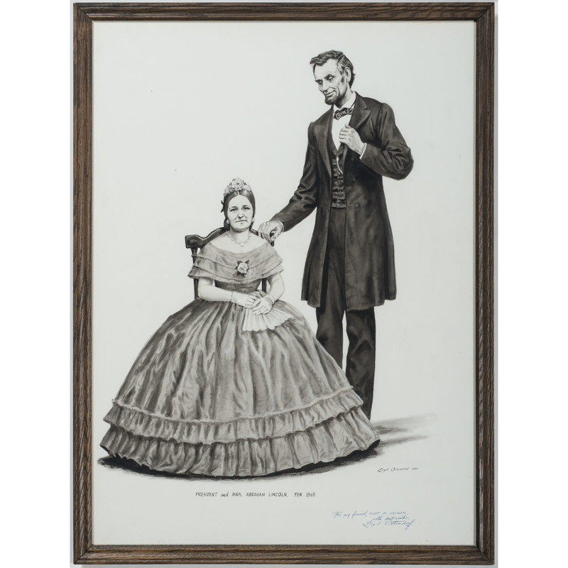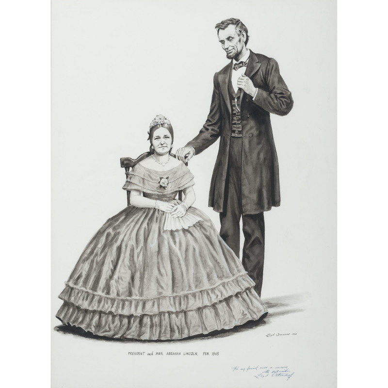 Pen and ink wash drawing, 22 x 30 in. (sight), framed to 24 x 30 in. President and Mrs. Abraham Lincoln, Feb. 1865. Signed, dated 1982, and inscribed lower right, "For my friend Kurt M. Kausler, Lloyd Ostendorf." A large, impressive rendering of a standing President Lincoln with Mary Todd Lincoln seated beside him.