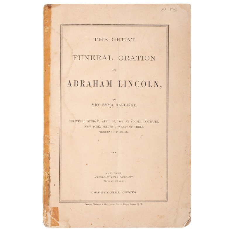 The Great Funeral Oration of Abraham Lincoln, by Miss Emma Hardinge. Delivered Sunday, April 16, 1865, at Cooper Institute, New York, Before Upwards of Three Thousand Persons. New York, NY: Wynkoop & Hallenbeck, 1865. 28pp, 5.75 x 8.75 in. Notably, one of the few sermons delivered by a woman. Emma Hardinge Britten (1823-1899) was a British orator, writer, and advocate for the early Modern Spiritualist Movement in the United States.