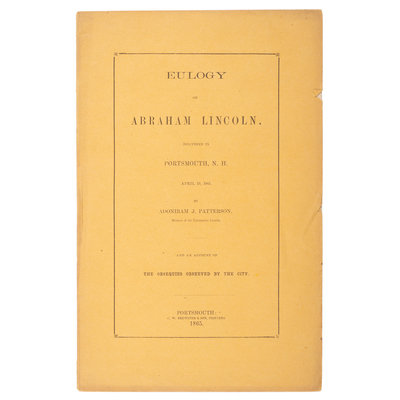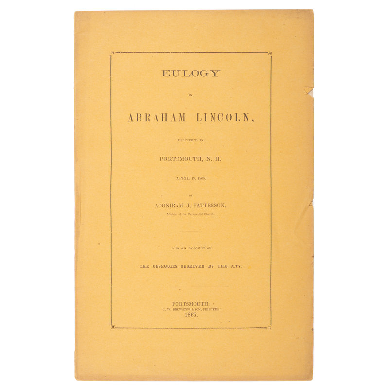 Eulogy on Abraham Lincoln, Delivered in Portsmouth, N.H. April 19, 1865. By Adoniram J. Patterson, Minister of the Universal Church. Portsmouth, NH: C.W. Brewster & Son, 1865. 30pp, 5.625 x 8.75 in.