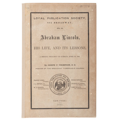 Abraham Lincoln, His Life, and its Lessons, A Sermon Preached on Sabbath, April 30, 1865. By Joseph P. Thompson, D.D. Pastor of the Broadway Tabernacle Church. New York, NY: 1865. 38pp, 5.75 x 8.75 in.