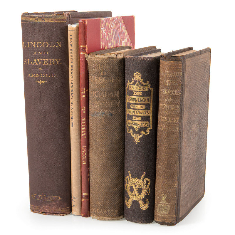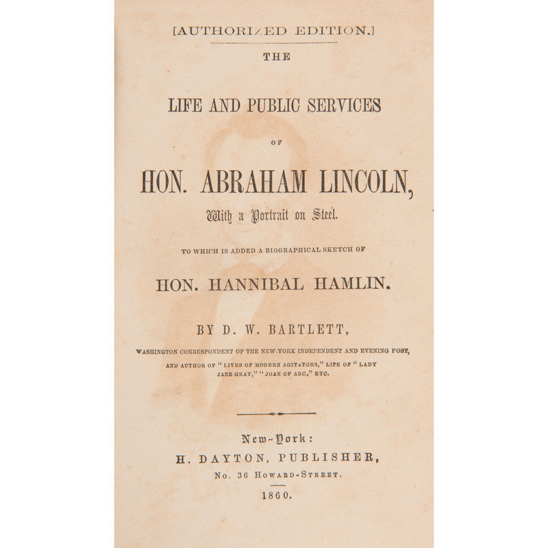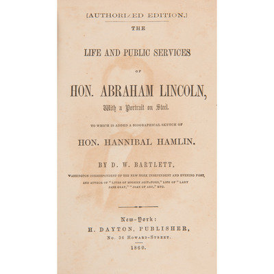 Lot of 5 titles. Bartlett, D.W. (Authorized Edition) The Life and Public Services of Hon. Abraham Lincoln...To which is added a biographical sketch of Hon. Hannibal Hamlin. New York, NY: H. Dayton, 1860. 12mo, brown cloth, 357pp. (Monaghan #26)