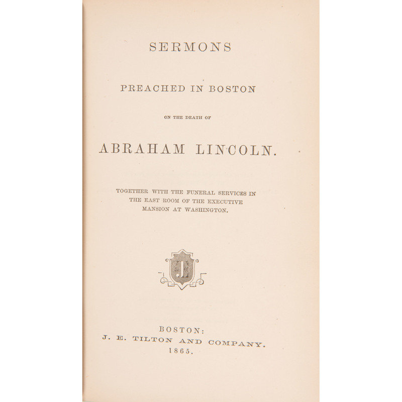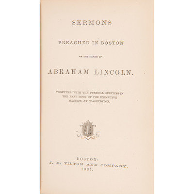 Sermons Preached in Boston on the Death of Abraham Lincoln. Boston, MA: J.E. Tilton & Co., 1865. 12mo, maroon cloth, 379pp plus ads.