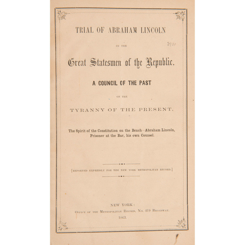 Trial Of Abraham Lincoln By The Great Statesmen Of The Republic. A Council Of The Past On The Tyranny Of The Present...New York, NY: Metropolitan Record, 1863. Small 8vo, bound pamphlet/wraps bound in three-quarter leather with marbled end sheets and boards, 29pp. A scarce Anti-Lincoln pamphlet (Monaghan #252)