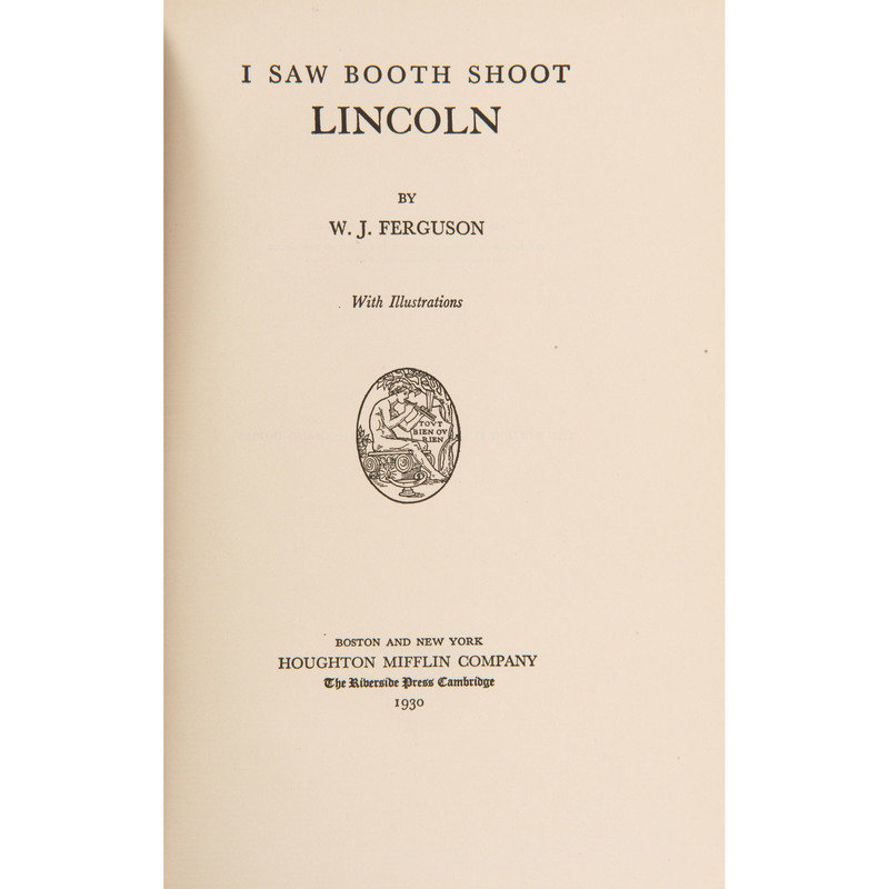 Ferguson, W.J. I Saw Booth Shoot Lincoln. Boston, MA and New York, NY: Houghton Mifflin Company, 1930. Small 8vo, black cloth with dust jacket, 63pp. First printing.