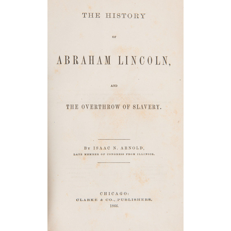 Arnold, Isaac. The History of Abraham Lincoln And The Overthrow Of Slavery. Chicago, IL: Clarke & Co., 1866. 8vo, red cloth, 736pp. First Edition by Arnold who personally knew Lincoln. (Monaghan #836)
