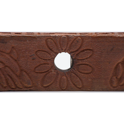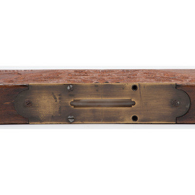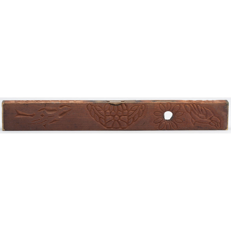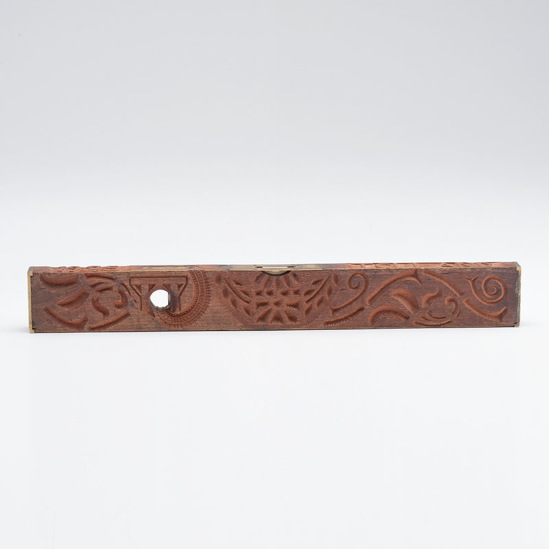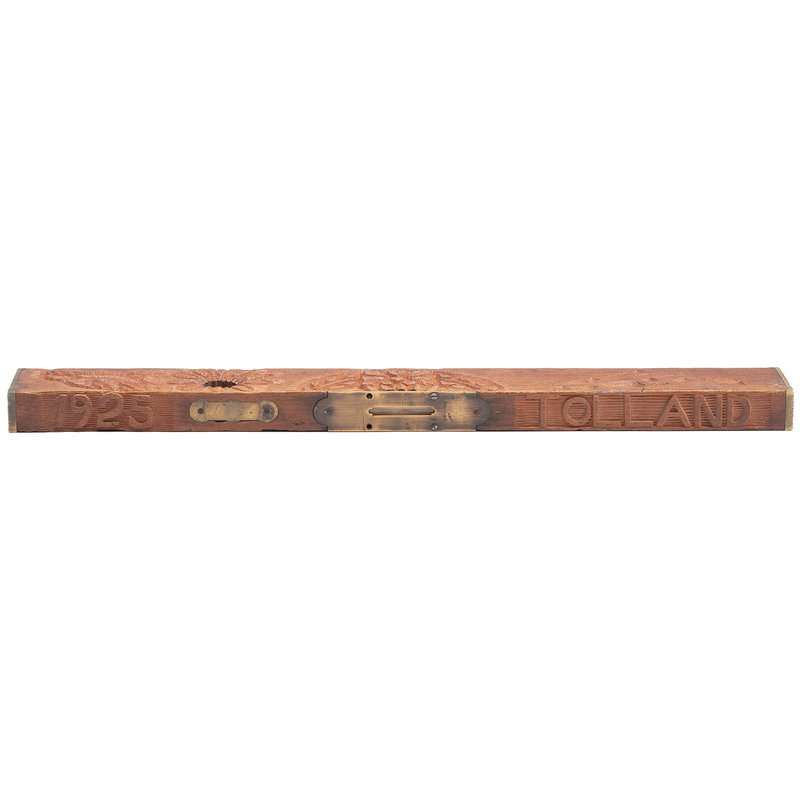 Wood level, 3 x 24 x 1.25 in., with "bubbles" on narrow edge and in a hole that goes through the wood (at right angles to each other); setting for top bubble and end caps brass. Top carved with "1925" and "Tolland" on either side of the bubble; one side with geometric and floral designs. One image is of a tunnel with a rail line running into it. Bottom has "The Moffat Tunnel." Reverse side with two birds, flower petals around the hole and floral design at center.