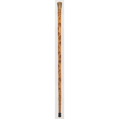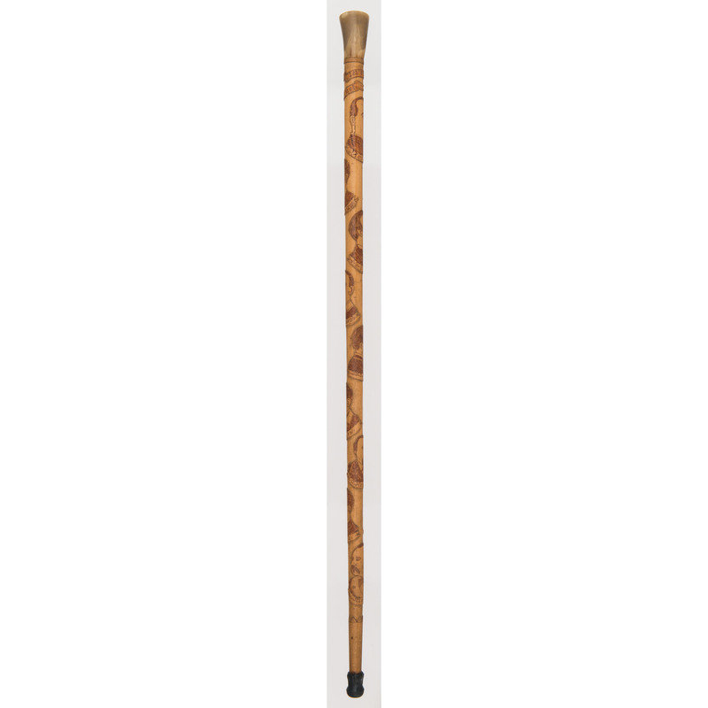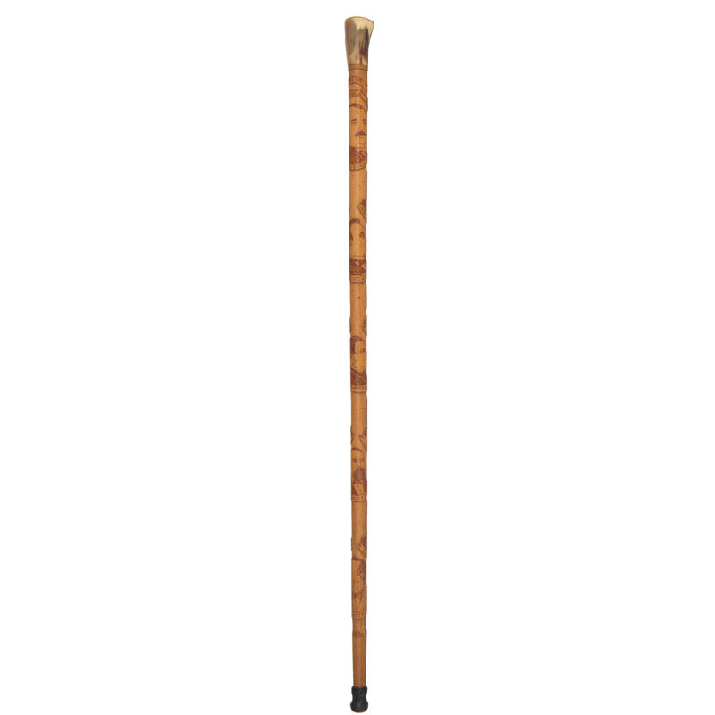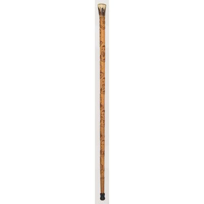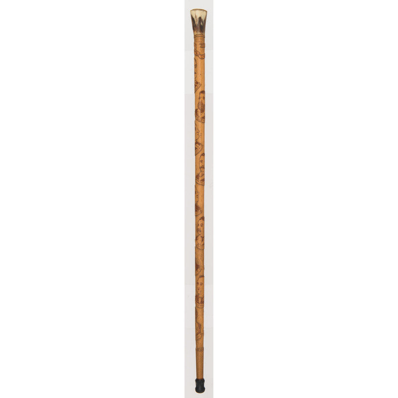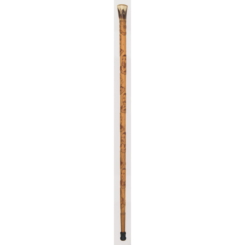 Hand carved wooden cane, approximately 35 in. long with bone handle. Banner near top reads, "Cleveland and his Cabinet," with bust-length portraits carved below in bas-relief. President Grover Cleveland appears first, with members of his cabinet appointed during his second term in office (1893-1897), including Secretary of State Walter Q. Gresham, Secretary of Treasury John G. Carlisle, Secretary of War Daniel S. Lamont, Postmaster General Wilson S. Bissell, Attorney General Richard Olney, Secretary of Navy Hilary A. Herbert, Secretary of Interior Hoke Smith, and Secretary of Agriculture Julius Sterling Morton, each identified beneath likeness.