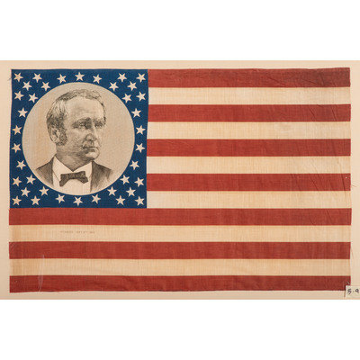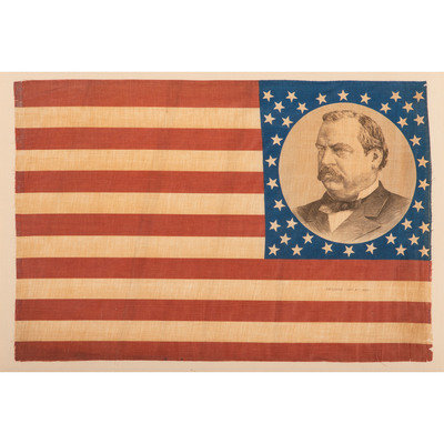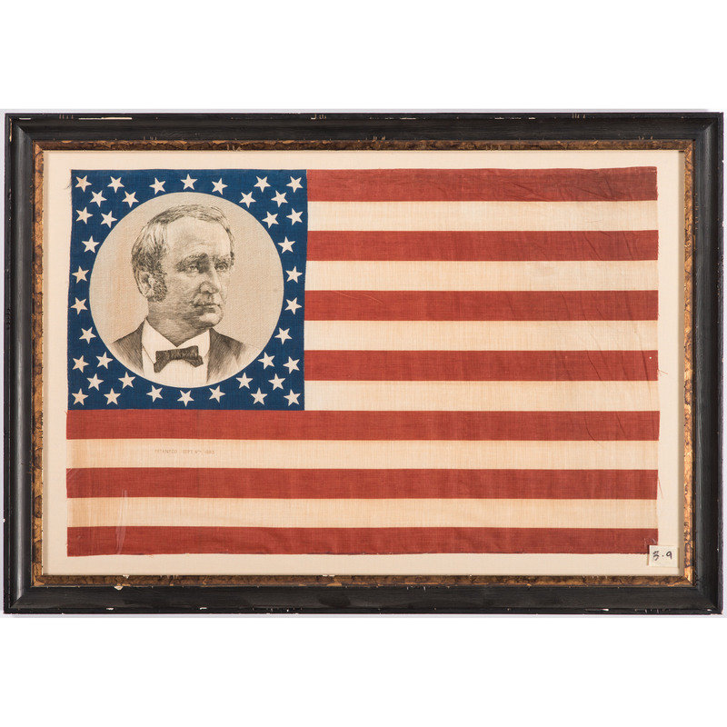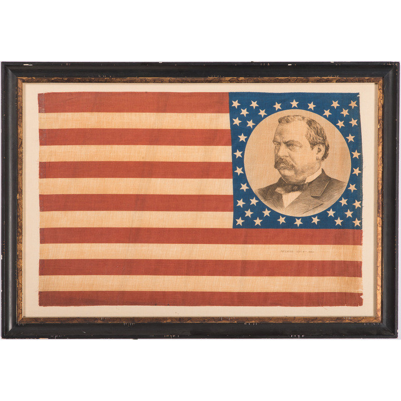 Lot of 2, both 17.75 x 27 in. printed cotton flags, archivally framed to 23 x 33 in. Cantons with portraits of the running mates surrounded by 38 stars, and "Patented September 4, 1883" in one of the white stripes. Portraits derived from engravings published by the Atlantic Publishing Company. Documented in The Stars and Stripes: Fabric of the American Spirit, J. Richard Pierce, LLC, 2005 (p. 52), and Collins' Threads of History (plates 525 & 526).