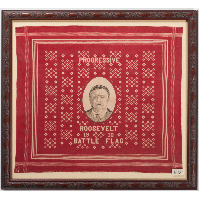 Cotton, 22 x 25.25 in. Progressive / Roosevelt / 1912 / Battle Flag. Lower left corner marked D&C / N.Y. Illustrated in Collins, Threads of History, no. 935. Archivally framed to 27 x 29.5 in.
