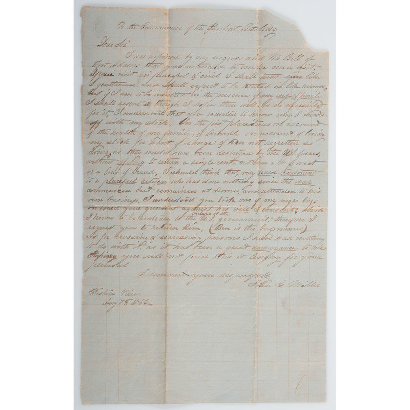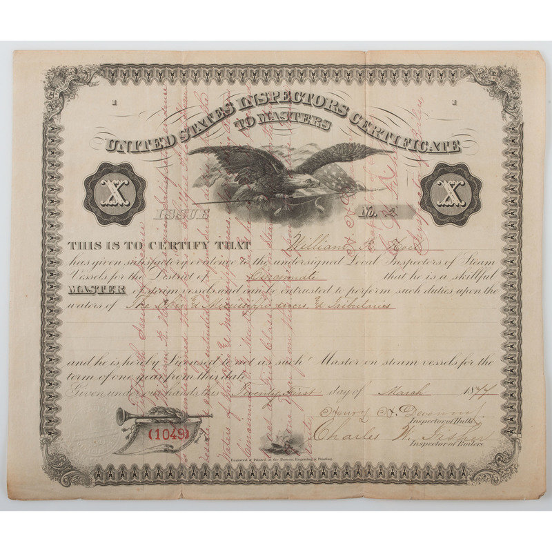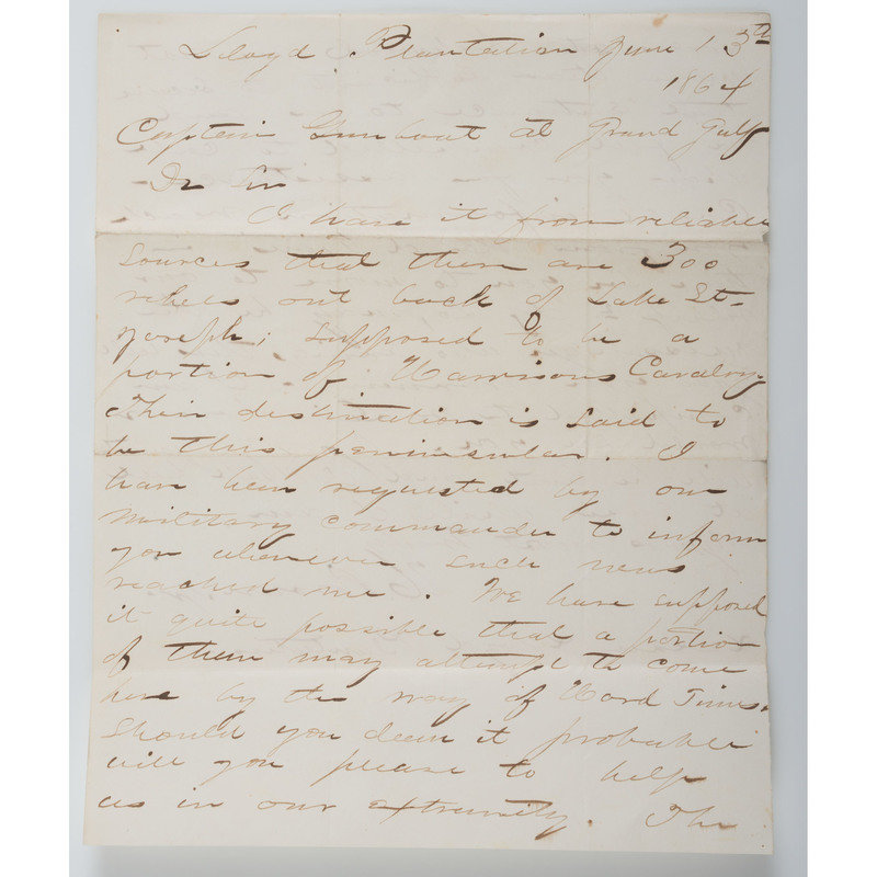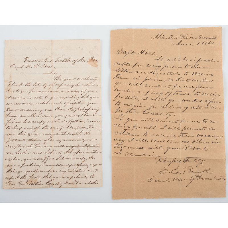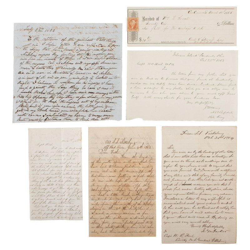 Lot of 80+ letters, documents, and ephemera related to Captain William Rion Hoel (1825-1879), a steamboat pilot who served as part of the USN's Mississippi River Squadron during the Civil War. Lot includes more than 65 war-date letters most of which were written to Hoel while he served as commander of the USS Pittsburgh and later the USS Vindicator. Also included are more than a dozen personal documents spanning approximately 1853-1876 and a Confederate First National Flag measuring approximately 8.25 x 4.5 in.