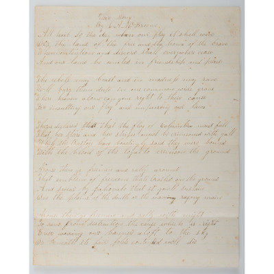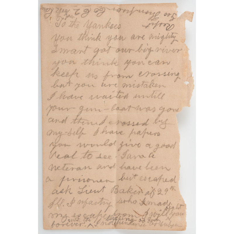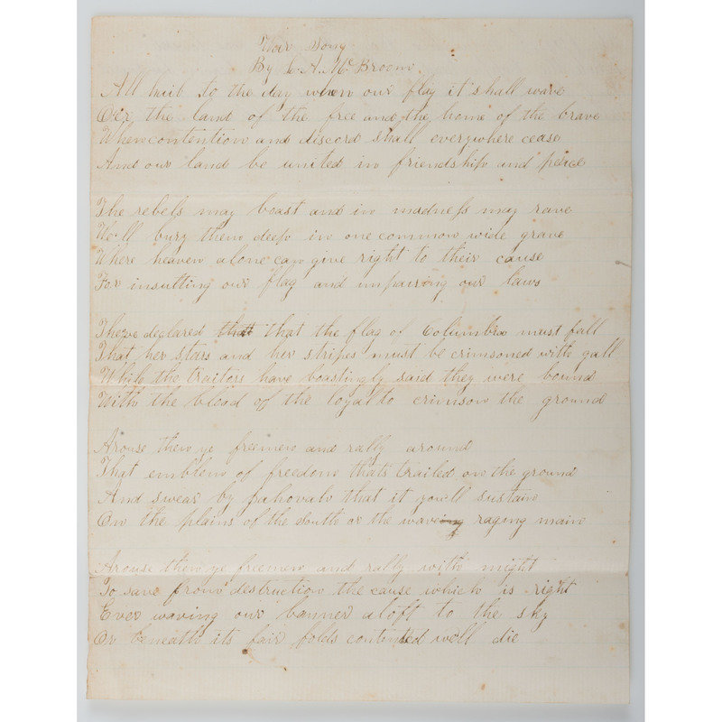 Hoel's archive contains letters from other Civil War soldiers, including an undated letter from a Confederate soldier who wished to taunt his Union counterparts: "To the Yankees / you think you are mighty smart got our big river you think you can keep us from crossing but you have mistaken I have waited untill your gun boat was gone and then I crossed by my-self I have papers you would give a good deal to see...I will fight you forever with the blessing of God...Respt Geo. Thompson Co. C 2nd Ark Cav." Also of interest are two songs, "War Song" and "Call for Volunteers," which were composed "By L. A. McBroom." Lewis Asbury McBroom of Hocking County, Ohio, enlisted as a Corporal with the OH 58th Infantry in 1861 and starting in 1863 served in the Department of the Tennessee with the Iron Clads Mississippi Squadron.