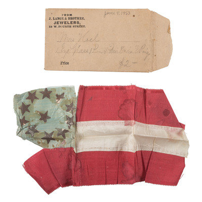 The Confederate First National flag accompanying the archive appears to have been stitched along the edge to accommodate a narrow wooden dowel holder indicating it may have been used as a parade flag of some sort. The eleven stars which mark the flag as a very early secession flag are appliqued cut-outs and appear to have once been gold or gilded. The flag itself is likely made of silk.